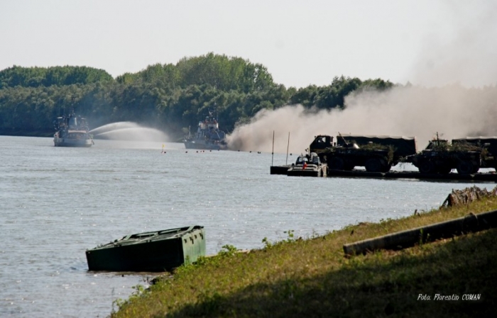 În cadrul exerciţiului, militarii Brigăzii 10 Geniu „Dunărea de Jos" şi-au demonstrat capacitatea de a asigura trecerea peste fluviu a trupelor şi tehnicii grele de luptă, prin mijloacele tehnice pe care le are la dispoziţie: pod de pontoane, portiţe mobile, bacuri şi ceamuri de mare capacitate. Au fost simulate atacuri din partea unor forţe inamice, pe apă, pe mal dar şi din aer. S-a folosit muniţie de manevră care a reprodus cât mai fidel atmosfera terifiantă a unor lupte reale. Aplicaţia a fost urmărită îndeaproape de mai mulţi oficiali din cadrul Ministerului Apărării Naţionale, în frunte cu ministrul Mircea Duşa, care a sosit în poligon în jurul orei 15.00, la bordul unui elicopter. Mai multe detalii în ediţia de mâine a cotidianului nostru.