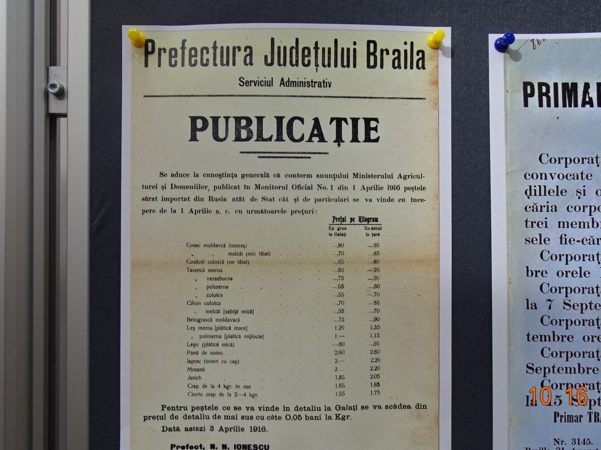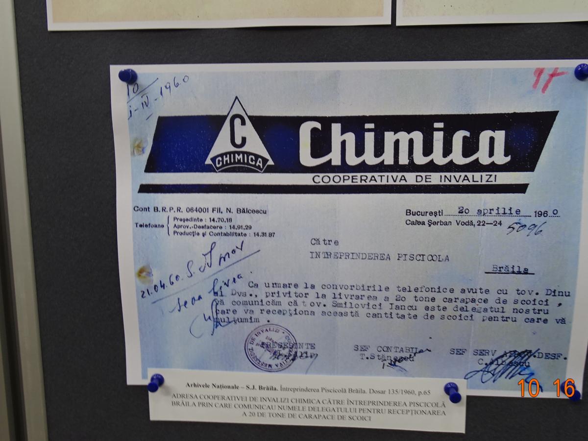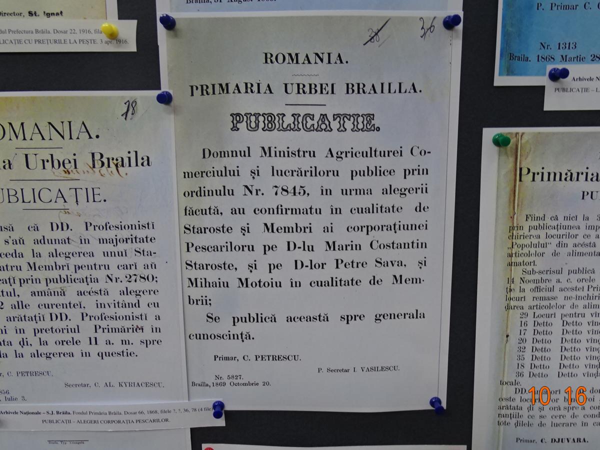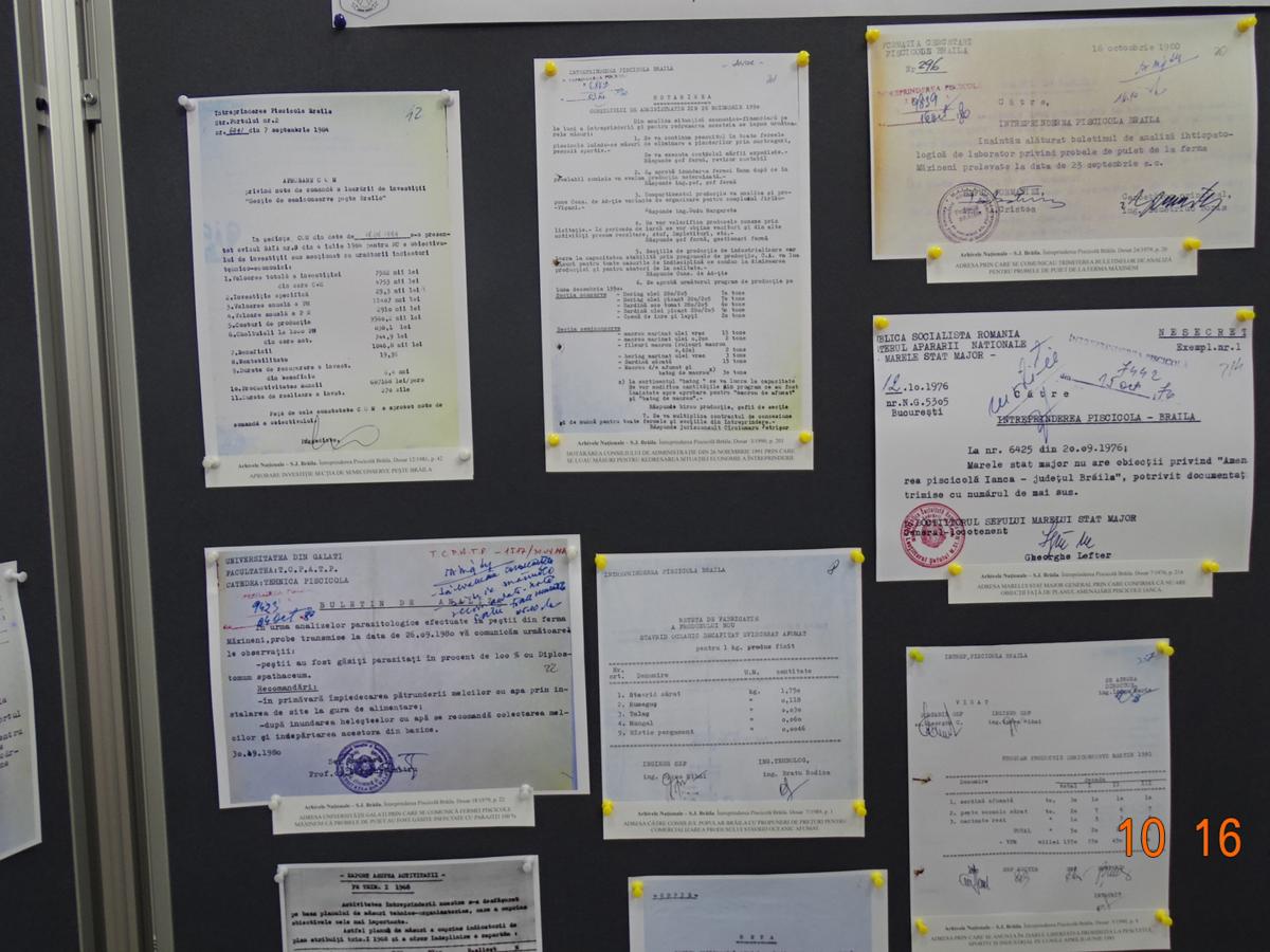 Intrăm, aşadar, în răcoarea “beciului”, ghid fiindu-ne Angela Chiriac, şef Serviciu Dezvoltarea Colecţiilor şi Catalogarea Documentelor. Bună cunoscătoare a fiecărui exponat şi pasionată de profesia sa, gazda noastră ne prezintă şi explică tot ceea ce este legat de originalitatea, vechimea,importanţa şi semnificaţia fotocopiilor. Pentru a căror privire cu atenţie îţi trebuie cam o jumătate de oră. Important este că ai ce vedea şi la ce să iei aminte: fotografii şi documente de epocă, hărţi, acte oficiale (Ordonanţe, Comunicate, înştiinţări şi Publicaţii, Monitoare Oficiale la nivel local etc.); schiţe ale unor amenajări piscicole (Măxineni, Jirlău, Bălţile Brăilei, Ianca, Balta Albă); situaţia pescuitului în al Doilea Război Mondial şi rechiziţiile făcute după 1944 de către Armata Sovietică. Sunt interesante şi documentele privind organizarea administrativă a celebrelor Pescării ale Statului, conduse cu pricepere de renumitul savant şi iubitor al naturii Grigore Antipa, autor al unei vaste lucrări consacrate pisciculturii româneşti.