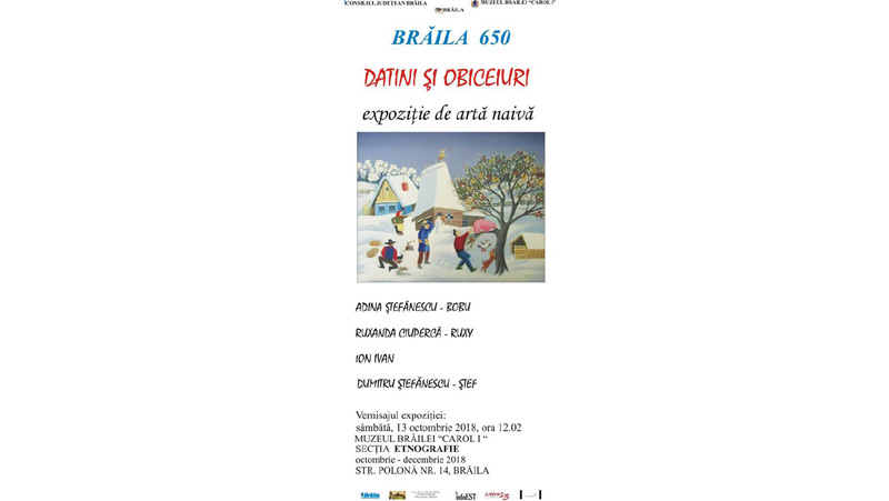 Sâmbătă, 13 octombrie 2018, ora 12,00, la Secţia „Etnografie” a Muzeului Brăilei „Carol I” din strada Polonă, nr. 14 va avea loc vernisajul expoziţiei de artă naivă “Datini şi obiceiuri”. Expoziţia cuprinde lucrări ale artiştilor: Adina Ştefănescu – Bobu, Ruxanda Ciupercă, Ioan Ivan şi Dumitru Ştefănescu – Ştef. Evenimentul de sâmbătă va fi coordonat de Dorina-Gabriela Cloşcă, şef Secţie „Etnografie” în cadrul Muzeului de Istorie „Carol l”.