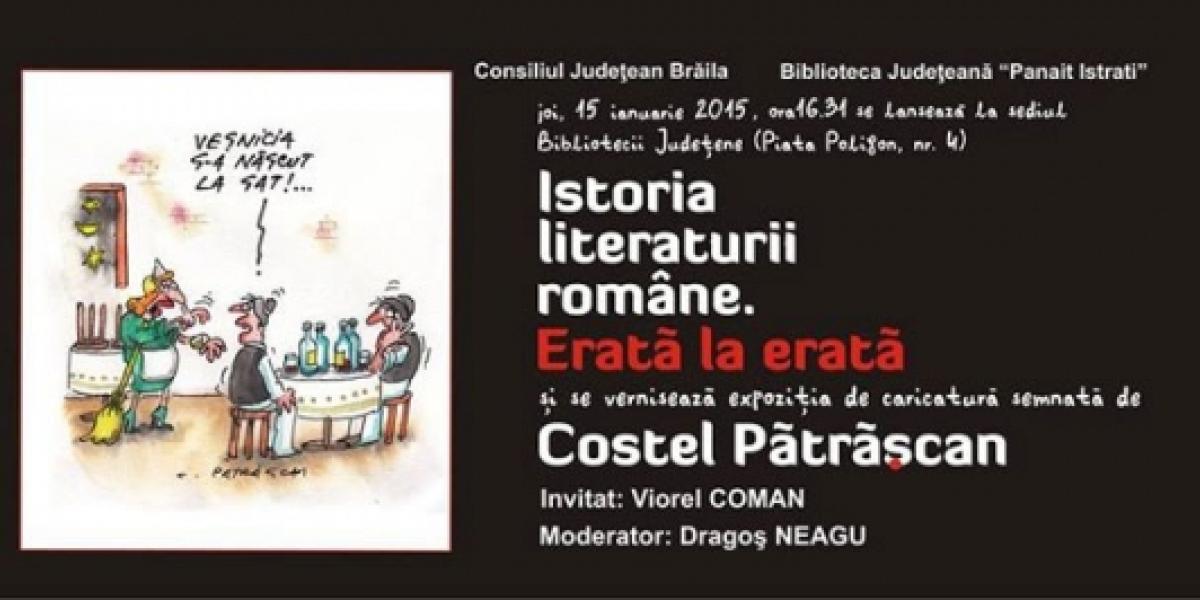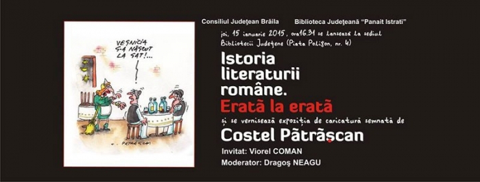 Biblioteca Judeţeană "Panait Istrati" organizează, joi, 15 ianuarie, lansarea "Istoriei literaturii române. Erată la erată" şi vernisajul unei expoziţii de caricatură semnată de Costel Pătrăşcan. Moderatorul evenimentului este directorul instituţiei organizatoare, Dragoş Neagu, iar invitat special scriitorul Viorel Coman.