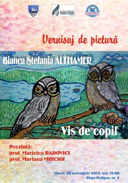 Vineri, 20 noiembrie, ora 15.00, la Biblioteca Judeţeană „Panait Istrati" Brăila are loc vernisajul expoziţiei de desen „Vis de copil" aparţinând Biancăi Ştefania Althamer, care expune peste 50 de lucrări pe simeze. Bianca este elevă la Liceul Pedagogic „D. P. Perpessicius" şi, la nouă ani şi jumătate, este pasionată de desen, muzică, dansuri şi gimnastică aerobică. A participat în ultimii ani la mai multe concursuri, iar talentul i-a fost răsplătit cu premii atât pe plan local, cât şi la nivel naţional: Locul I, în septembrie 2015, la Tecuci, la Concursul naţional de artă plastică şi iconografie „Ucenici la porţile credinţei"; Locul III la Concursul naţional "Metaforă şi culoare în zi de sărbătoare", în ianuarie 2015, la Brăila; Locul I la Expoziţia internaţională „Nostalgii de toamnă" de la Moreni, în noiembrie 2014; Locul I la Concursul "Oraşul meu, oraşul tău" organizat de Biblioteca Judeţeană în noiembrie 2014, concurs la care participă şi în acest an.