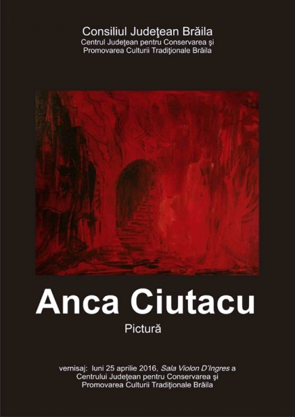 Luni, 25 aprilie 2016, ora 17.00, la Galeria Violon DIngres din incinta Centrului de Creaţie Brăila va avea loc vernisajul expoziţiei de pictură semnată de Anca Ciutacu. Aflată la cea de a şasea expoziţie, Anca Ciutacu pictează din anul 2013, intuitiv, autodidact, susţine că este conectată la fiinţa interioară şi la divinitate din respect pentru tatăl său şi că este îndrumată de părintele Arsenie Boca în realizarea operelor sale.