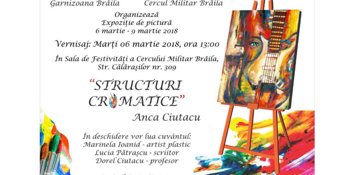 Marţi, 6 martie, ora 13.00, în Sala de Festivităţi a Cercului Militar Brăila are loc vernisajul expoziţiei “Structuri cromatice”, de Anca Ciutacu. În deschidere vor lua cuvântul Marinela Ioanid, artist plastic, Lucia Pătraşcu, scriitor, şi Dorel Ciutacu, profesor. Evenimentul organizat de Garnizoana Brăila şi Cercul Militar se va încheia cu un recital Doru Ciutacu.