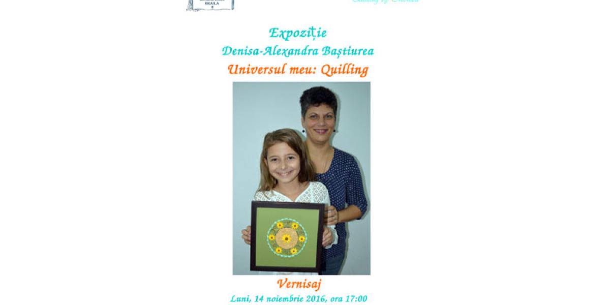 Casa de Cultură a Municipiului Brăila şi Quilling by Monica organizează luni, 14 noiembrie 2016, vernisajul expoziţiei Universul meu: Quilling, unde vor putea fi admirate lucrările realizate de artista Denisa-Alexandra Baştiurea.