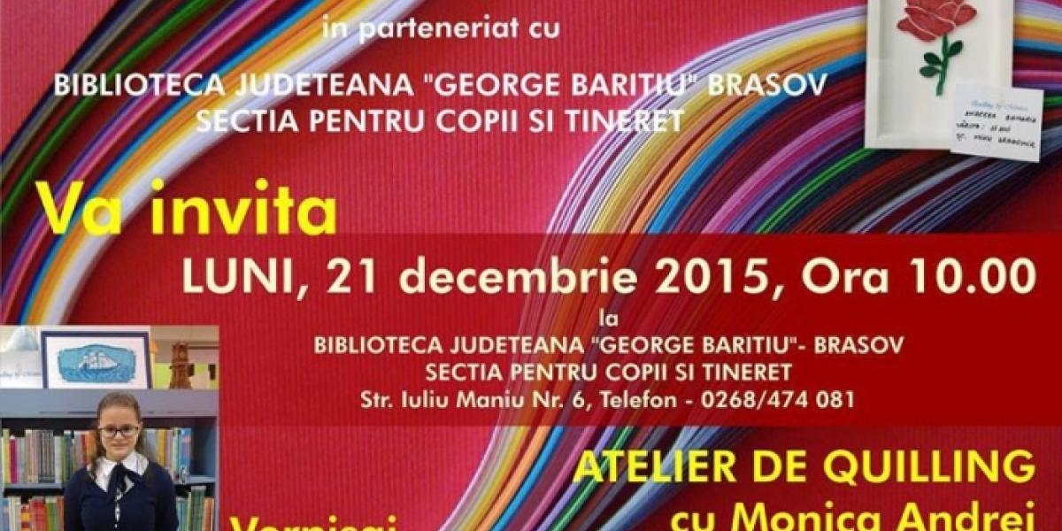 Biblioteca Judeţeană "George Bariţiu" Braşov va găzdui pe 21 decembrie 2015, ora 10.00, vernisajul expoziţiei de tablouri realizate în tehnica quilling al brăilencei Andreea Ştefania Zaharia. Lucrările au tematică de Crăciun şi sunt realizate la atelierul de quilling din cadrul Secţiei pentru Copii (Ludotecă) a Bibliotecii Judeţene "Panait Istrati" Brăila, sub coordonarea Monicăi Andrei, de la "Quilling by Monica".