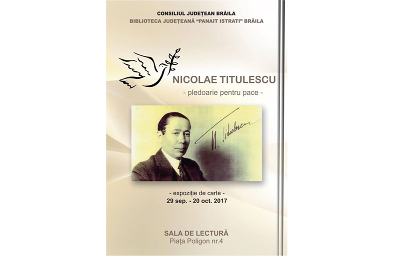 Până pe data de 20 octombrie 2017, Sala de Lectură a Bibliotecii Judeţene “Panait Istrati” Brăila găzduieşte expoziţia documentară Pledoarie pentru pace, dedicată marelui diplomat Nicolae Titulescu.