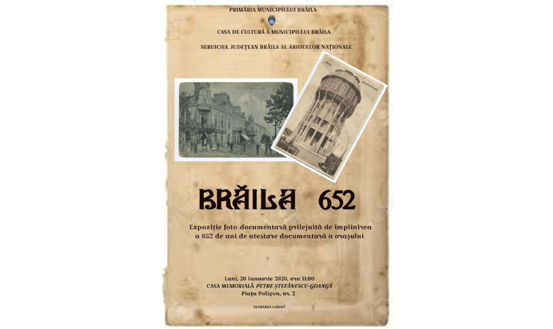 Casa de Cultură a municipiului Brăila, cu sprijinul Serviciului Judeţean Brăila al Arhivelor Naţionale, vernisează, luni, 20 ianuarie 2020, ora 12.00, la Casa Memorială “Petre Ştefănescu Goangă”, o expoziţie fotodocumentară realizată cu prilejul împlinirii a 652 de ani de atestare documentară a municipiului Brăila.