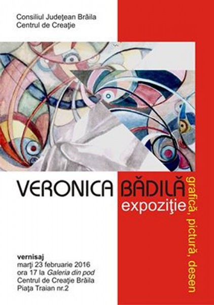 Marţi, 23 februarie 2016, de la ora 13.00, la Galeria din Pod din Piaţa Traian nr. 2 are loc vernisajul expoziţiei de grafică, pictură şi desen - autor Veronica Bădilă. Organizatorul acestui eveniment, care face şi oficiile de gazdă, este Centrul Judeţean pentru Conservarea şi Promovarea Culturii Tradiţionale Brăila. Intrarea este liberă.