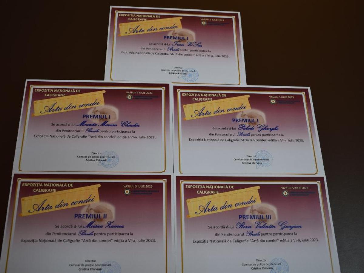 Se mai explică faptul că, în urma jurizării au fost alese și expuse un număr de 68 de lucrări, printe care și 16 lucrări realizate în cadrul etapelor derulate la nivelul Penitenciarului Brăila, etape ce au constat în: selectarea persoanelor private de libertate participante la activitatea interpenitenciară redactarea lucrărilor de caligrafie, evaluarea și expedierea lor. ”Penitenciarul Brăila a abținut 5 premii , respectiv 3 – Premii I ; 1- Premiul II și 1 – Premiul III”, a mai spus sursa citată.