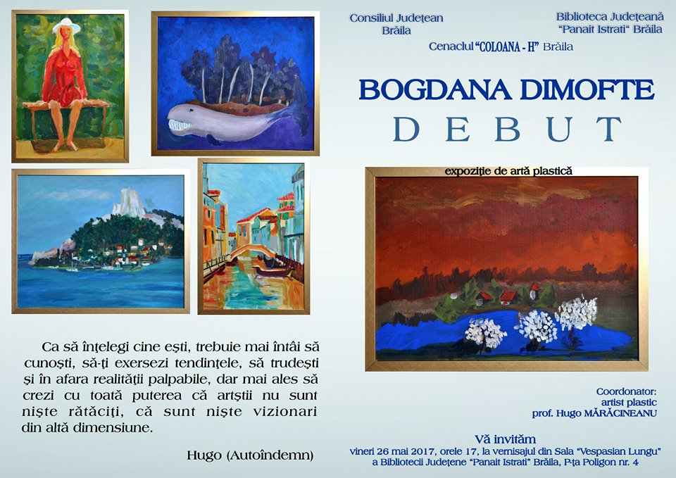 Astăzi, 26 mai, începând cu ora 17.00, în sala ”Vespasian Lungu” a Bibliotecii Județene ”Panait Istrati” are loc vernisajul expoziției de artă plastică ”Bogdana Dimofte – DEBUT”.