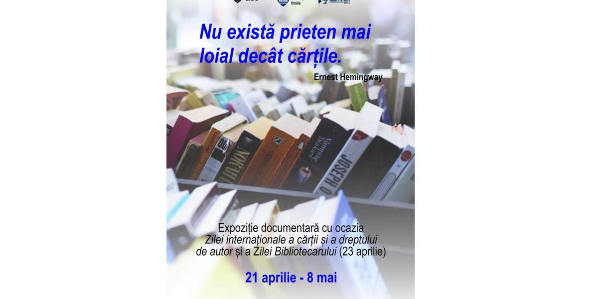 Cu ocazia Zilei Internaționale a cărții și a dreptului de autor și a Zilei Bibliotecarului (23 aprilie), în perioada 21 aprilie – 8 mai 2023, Biblioteca Județeană "Panait Istrati" Brăila organizează o expoziție documentară intitulată ”Nu există prieten mai loial decât cărțile”, titlu inspirat din celebrul citat al marelui scriitor Ernest Hemingway.