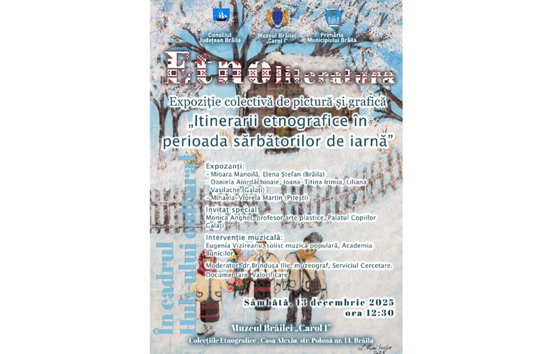 Muzeul Brăilei „Carol I” - Casa Colecțiilor Etnografice invită publicul brăilean în ziua de sâmbătă, 13 decembrie 2025, începând cu ora 12:30, la Casa Alexiu - monument istoric din Strada Polonă nr. 14, la vernisajul Expoziției colective de pictură și grafică „Itinerarii etnografice în perioada sărbătorilor de iarnă”.