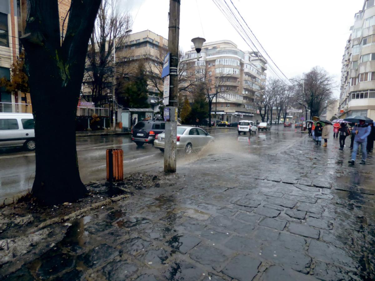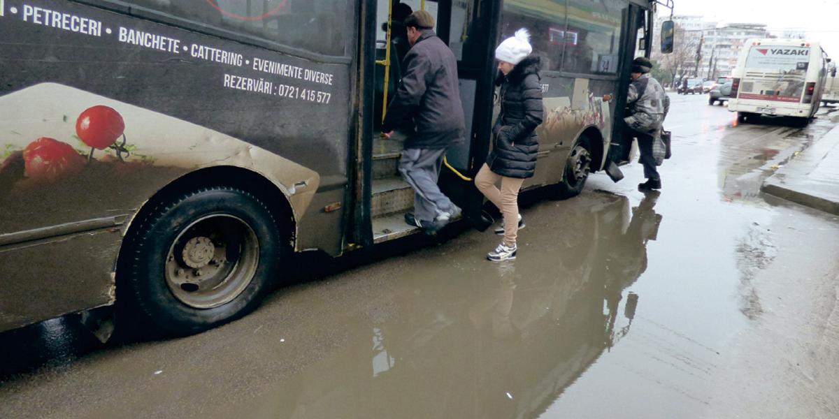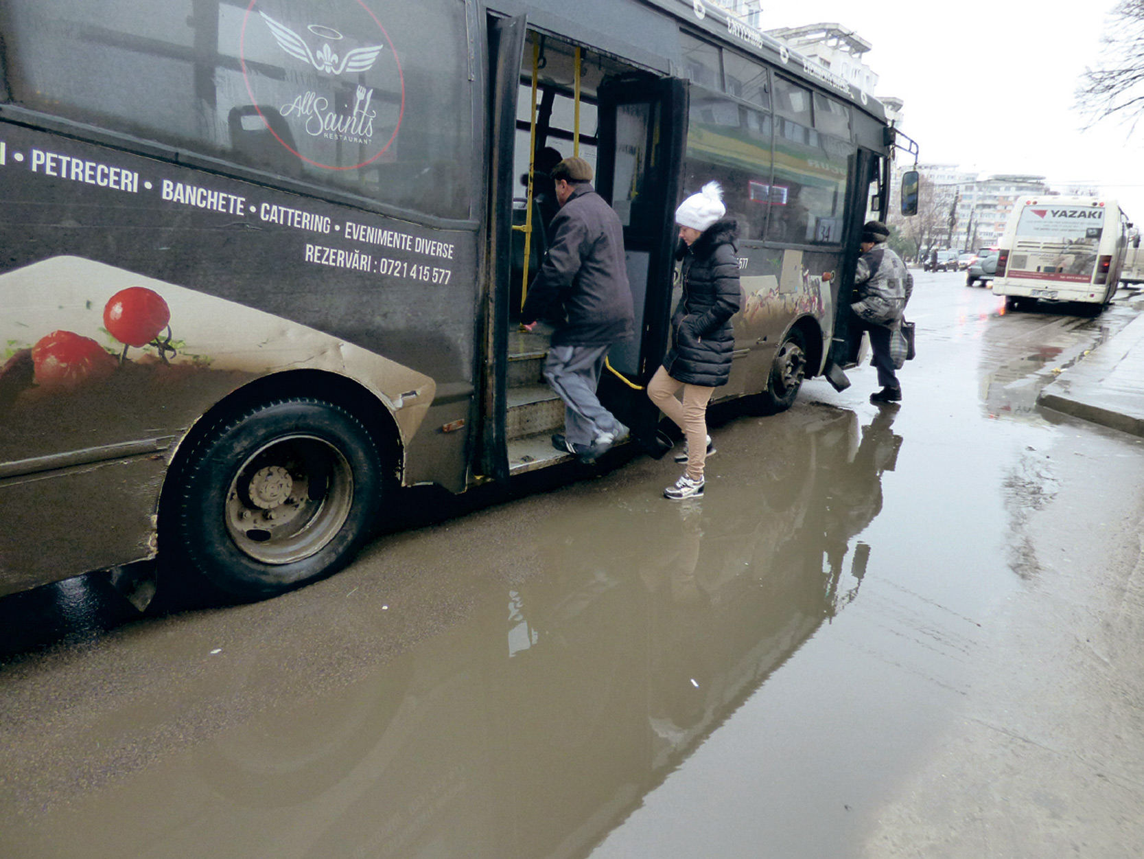Topirea zăpezilor negre şi ploaia au favorizat apariţia băltoacelor pe trotuar, carosabil, la rigolă, dar şi în multe staţii de autobuz. De pomină este staţia Piaţa Concordiei, unde, atunci când sosesc simultan câte 3-4 autobuze, călătorii sunt nevoiţi să trecă prin apa de o palmă. Dar sfânta comoditate şi indolenţa unor conducători auto se manifestă şi când e vorba doar de un singur autobuz sau microbuz. Păi, de ce să tragă dom' şofer puţin de volan dreapta până la bordură şi apoi la stânga, pe direcţia de mers ?! Şi de parcă nu ar fi de ajuns, pietonii trebuie să traverseze şi bălţile de pe trotuare, ori să se ferească de acei conducători auto din trafic, şi care circulă cu viteză prin bălţile de la rigolă, având parcă o plăcere sadică de a te uda din cap până în picioare cu apa sau mocirla din staţii sau de pe carosabil. Oare aceşti tupeişti nu sunt surprinşi de camerele de luat vederi ale Poliţiei?!