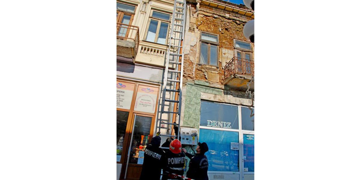 Pe lângă deja „clasicele” pericole publice reprezentate de clădirile fostului CEC şi a fostului hotel „Pescăruş”, din faţadele cărora se desprind periodic bucăţi de tencuială ce i-ar putea răni grav pe trecătorii surprinşi în zonă, mai există şi alte imobile pe Str. Mihai Eminescu aflate în situaţii similare. Zilele trecute, o bucată din faţada unui astfel de imobil s-a prăbuşit pe trotuar şi doar o minune a făcut ca nimeni să nu fie rănit. Poliţiştii locali care patrulau în zonă au solicitat intervenţia unui echipaj al Inspectoratului pentru Situaţii de Urgenţă, pentru îndepărtarea porţiunilor din tencuiala faţadei dar şi elementele decorative ce ameninţau să se desprindă şi să cadă de la înălţime. Pompierii au venit, au studiat problema, însă nu au intervenit. „Dacă începem să tragem de acea bucată de tencuială care este deja desprinsă de zid, e foarte posibil ca aceasta să antreneze o porţiune mult mai mare, care să îl pună în pericol pe colegul nostru aflat pe scara de intervenţie. La cât de degradată este această faţadă, e nevoie de o echipă specializată, dotată cu schelă”, ne-a explicat unul dintre pompierii sosiţi la faţa locului.