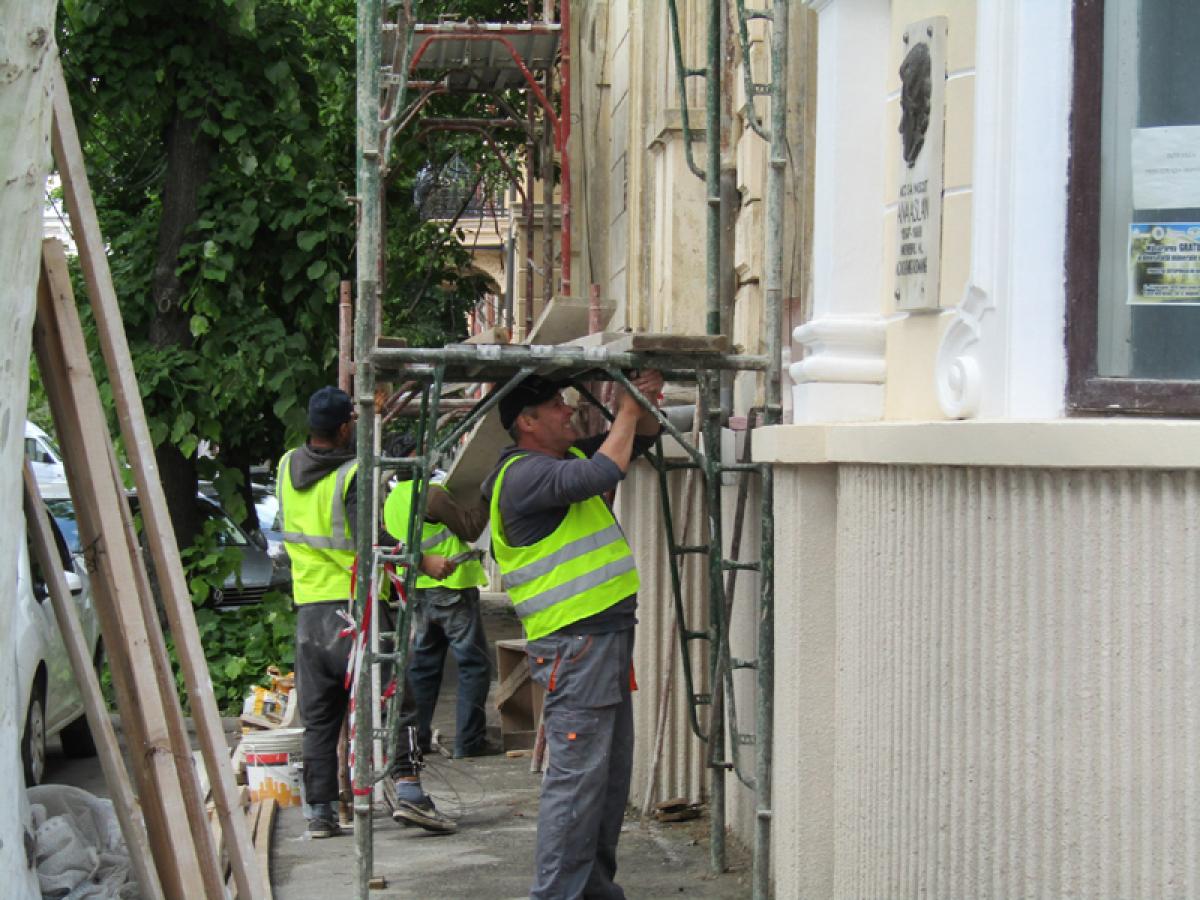• imobilul și-a recăpătat frumusețea originală pe latura dinspre strada Hepites, iar pe cea de pe strada Ana Aslan lucrările sunt în plină desfășurare • de reabilitare se ocupă o echipă coordonată de cunoscutul maistru brăilean Teodor Gurgu • finanțarea este asigurată de doamnele Speranţa Prada şi Teodora Bărbulescu, reprezentante ale Fundației ”Ana Aslan” București