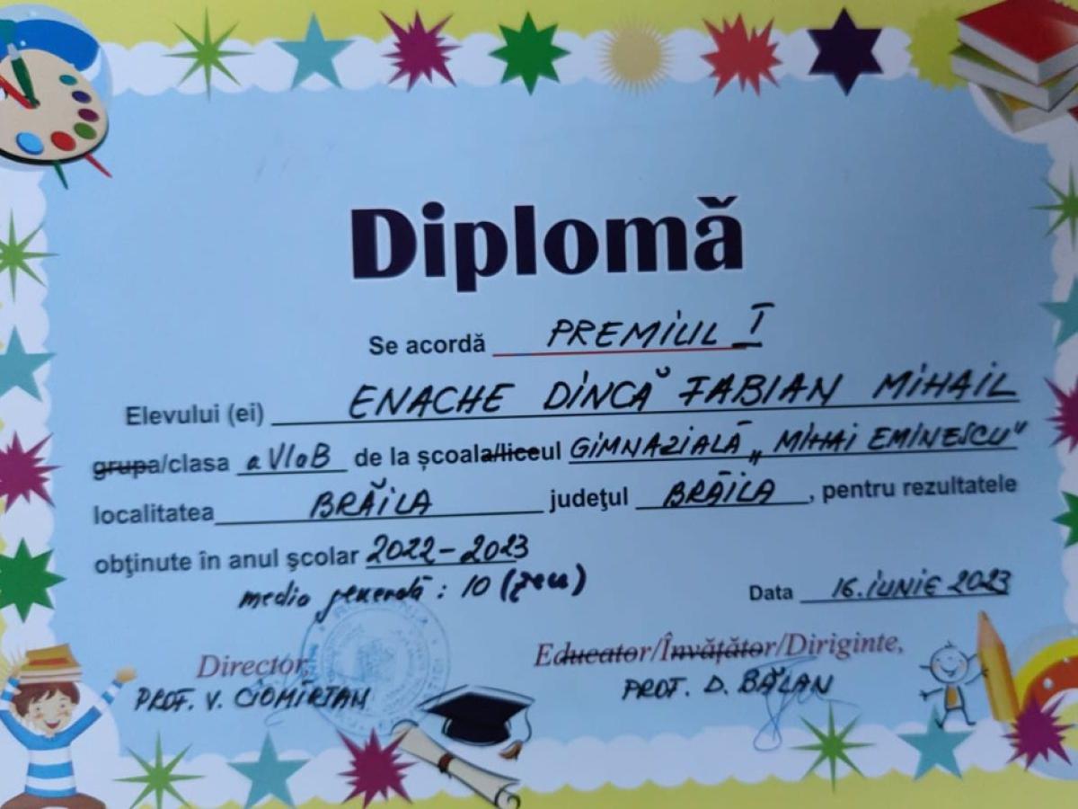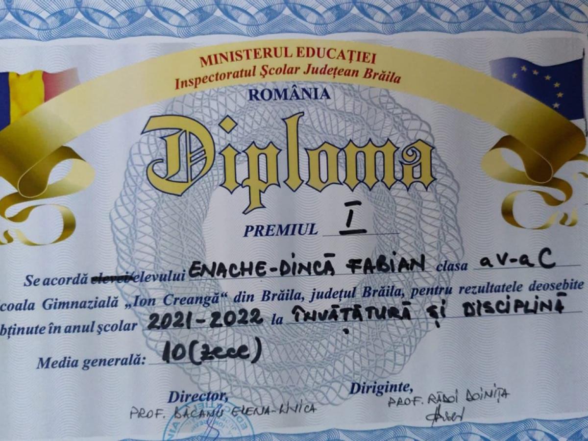 • de când a început școala, a învățat constant, a visat cu ochii deschiși și a muncit pentru visul său, iar astăzi, Mihail Fabian Dincă Enache, absolvent al Școlii Gimnaziale „Mihai Eminescu”, este singurul elev din județul Brăila care a obținut media 10 la Evaluarea Națională • cu nota maximă la ambele probe, Limba română și Matematică, Fabian confirmă o traiectorie școlară impecabilă, cu 10 pe linie din clasa pregătitoare până în clasa a VIII-a