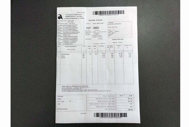 „Subsemnatul Florin Sofronov, domiciliat în Brăila, B-dul Alexandru Ioan Cuza nr. 27, vă fac cunoscut faptul că, în data de 4 ianuarie 2024, am primit factura nr. 01707866/31. 12. 2023, emisă de Compania de Utilități Publice „Dunărea” Brăila SA. Am constatat cu uimire că, la punctul 3 al facturii, și anume METEO, am de plată 15 metri cubi de apă! Transformând 15 mc în litri (1 mc â 1.000 litri), rezultă o cantitate de apă foarte mare de apă, mai precis 15.000 de litri. Altfel spus, în fiecare zi a lunii decembrie, am avut câte 484 de litri de apă în curte (15.000 împărțit la 31 de zile)!