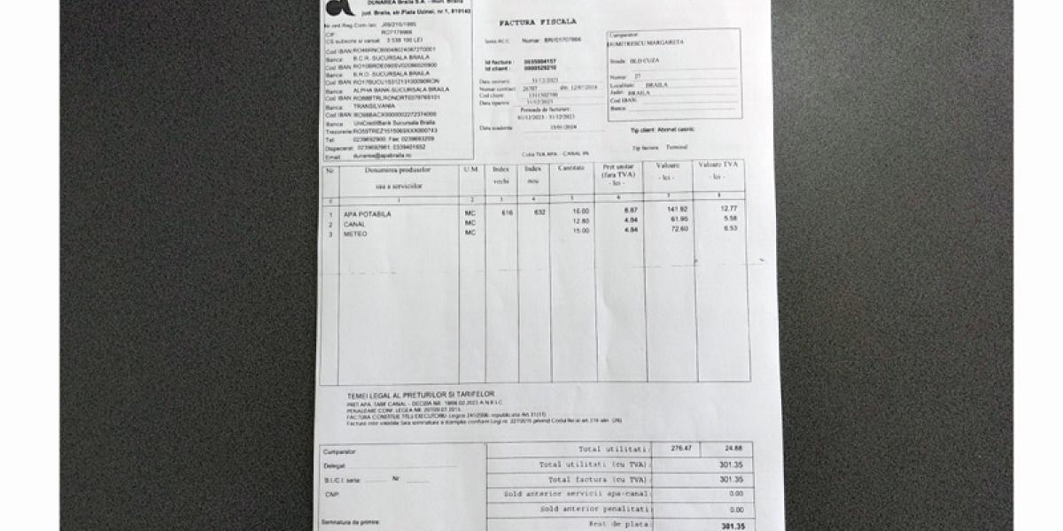 Redăm mai jos, spre edificare, petiția semnată de inginerul Sofronov, cu lămuririle de rigoare, precum și copia facturii emise de CUP „Dunărea” Brăila SA pentru luna decembrie 2023.