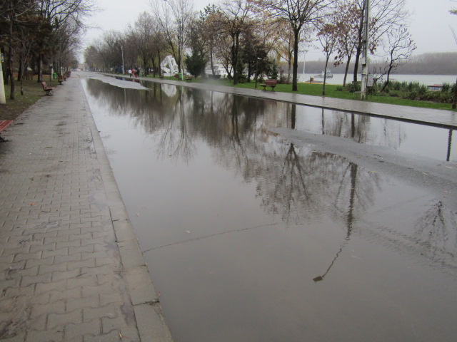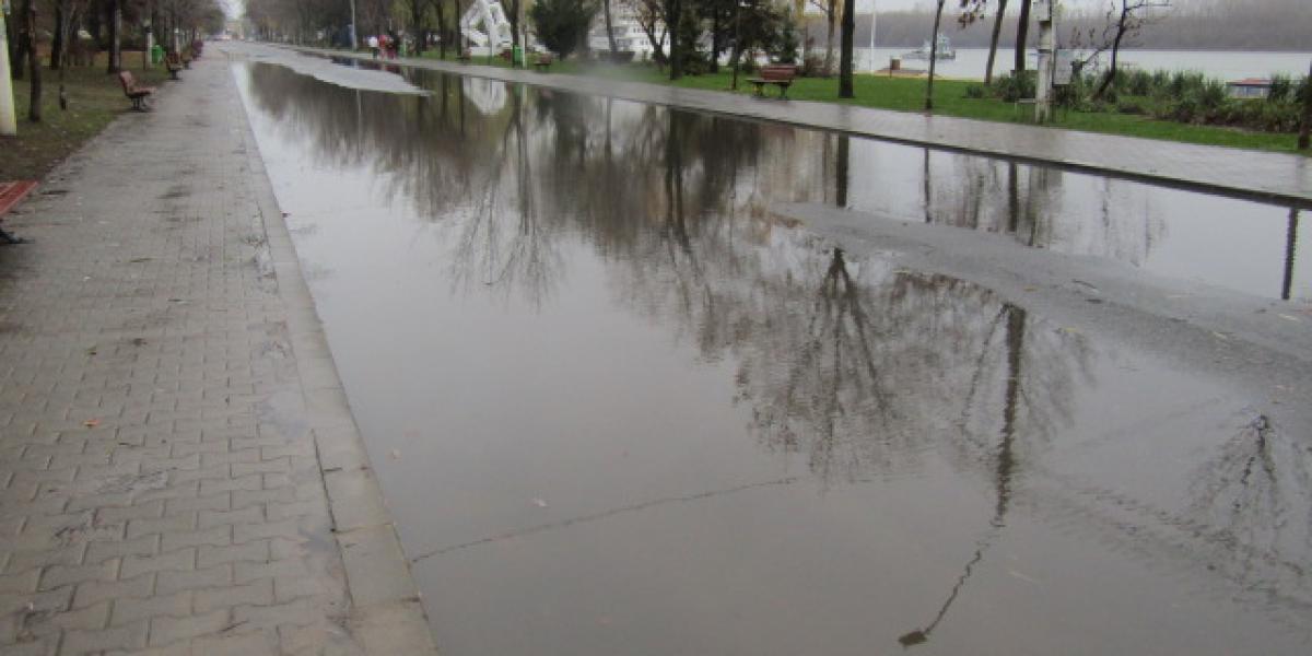 Faleza Dunării se umple de apă după fiecare ploaie mai serioasă. Situaţia nu este de azi de ieri, dar s-a accentuat foarte mult în urma recentei reabilitări, de proporţii, a falezei. Când, din cauza unui prost obicei al Seroplant (devenit regulă), pe trotuar și carosabil a rămas, din greu, pământ căzut de pe roțile utilajelor folosite la lucrări. Şi a fost de-ajuns, deoarece, fiind deja colmatată cu praf şi frunze, canalizarea nu a mai putut prelua apele pluviale. Aşa că faleza s-a umplut, pe zeci şi sute de metri, cu bălţi de diferite mărimi, chiar şi din bordură în bordură. Gaigerele abia se mai puteau vedea, doar unde era apa mai mică nu şi acolo unde apa cu mâl depăşea 10-15 cm adâncime.