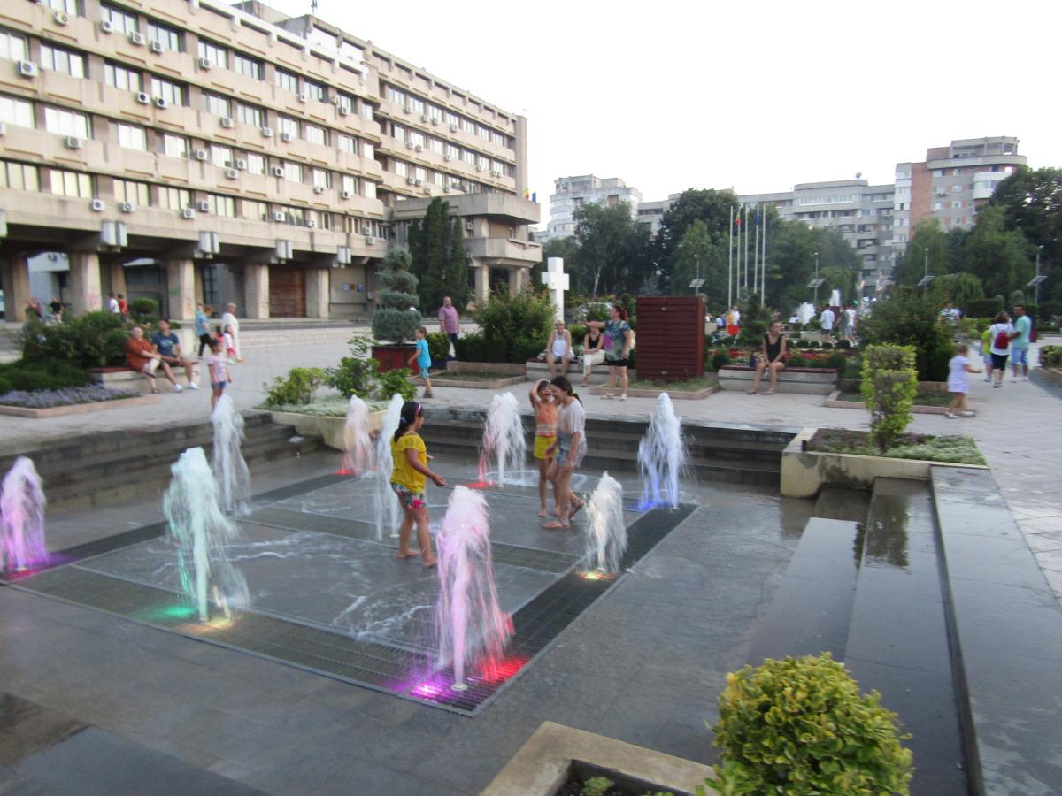Ne continuăm traseul, sus, pe platoul din faţa Primăriei. Aici, în una din cele două arteziene cu jeturi colorate, mai mulţi puradei se bălăceau gălăgioşi, aruncând cu apă şi spre cei din afara bazinului. “Hai să mergem la fântâniţa de lângă liceu, că este mai linişte acolo”, spunea cineva venit la plimbare cu un vecin de cartier. Au avut noroc, fiindcă după o perioadă de întrerupere din cauza lipsei unor piese de schimb, acum mica şi cocheta fântână este funcţională.