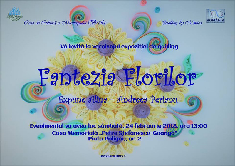 Casa de Cultură a Municipiului Brăila şi Quilling by Monica organizează sâmbătă, 24 februarie 2018, vernisajul expoziţiei de quilling intitulată “Fantezia Florilor”, unde vor putea fi admirate lucrările realizate de artista Alina-Andreea Perianu.