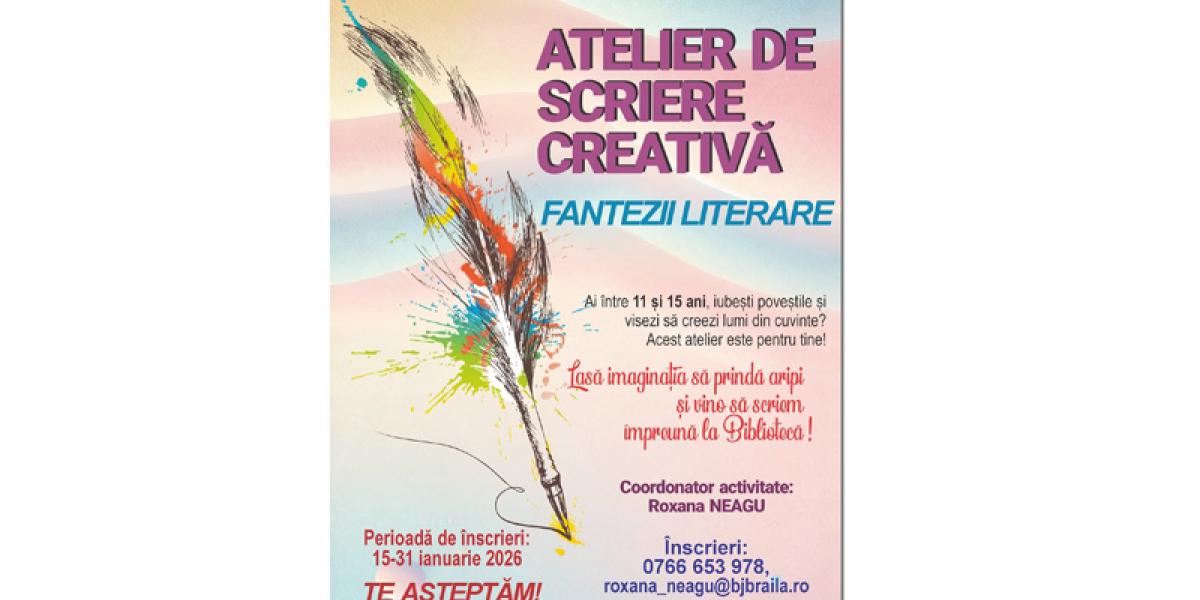 Înscrierile pentru Atelierul de scriere creativă „Fantezii literare”se desfășoară în perioada 16-31 ianuarie 2026, iar informații suplimentare pot fi obținute la numărul de telefon 0766.653.978. Atelierul va fi coordonat de Roxana Neagu, care va îndruma participanții în procesul de descoperire și dezvoltare a potențialului literar.