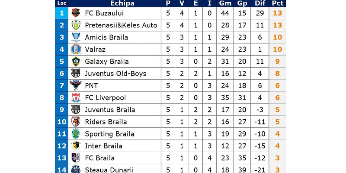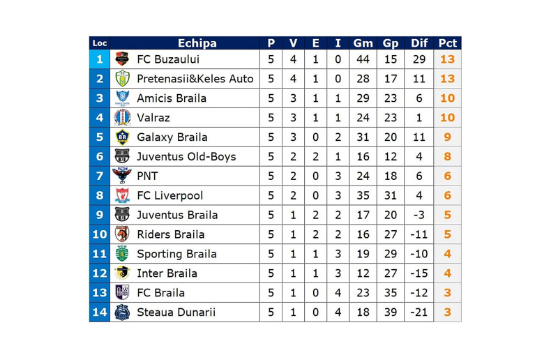 După etapa a 5-a lider în campionat este FC Buzăului cu 13 puncte (golaveraj 44-15), iar pe locul al doilea, tot cu 13 puncte, dar cu un golaveraj inferior 28-17, se află Pretenașii. Următoarele două poziții sunt ocupate de: Amicis Brăila 10 puncte (golaveraj: 29-23), respectiv Valraz 10 puncte (24-23).
