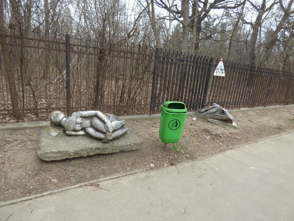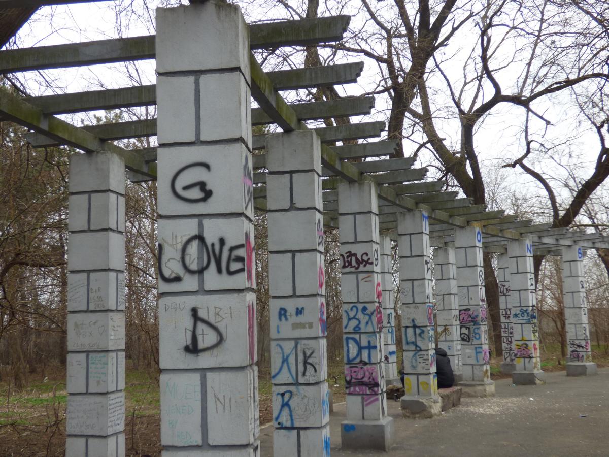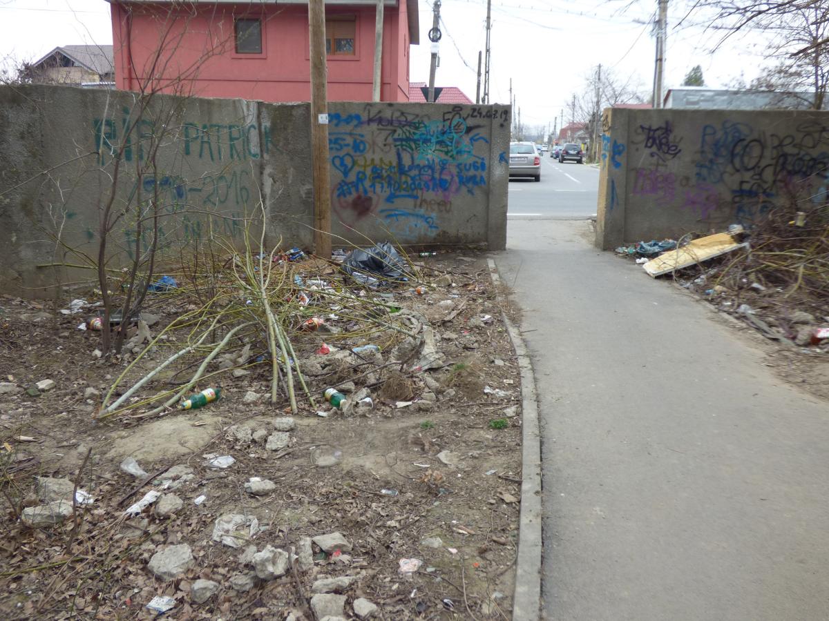 În capătul aleii centrale, şi ea flancată de arbori uscaţi, o pergolă de ani de zile este fără flori, însă e plină cu obscenităţi şi fel de fel de mesaje transmise între tineri. Puţin mai încolo, o altă situaţie cu totul condamnabilă, în zona aleii care duce la deschizătura din gardul de beton ce face legătura cu străzile din Radu Negru. Aici, mormane uriaşe de gunoi, resturi menajere, crengi şi corzi de viţă de vie şi tot ce le-a venit la îndemână unor nesimţiţi de riverani să arunce de-a lungul gardului, în interiorul parcului. Inclusiv o cadă veche şi câteva WC-uri sparte şi-au făcut apariţia printre gunoaie! Apropo: cu ani de zile în urmă, acesul dinpre cartier se făcea printr-o poartă, apoi printre nişte ţevi metalice, şi curăţenia tot nu se menţinea. Motiv pentru care s-a completat gardul cu plăci din beton, în calea celor lipsiţi de civilizaţie. Ei nu mai puteau intra, astfel, cu roaba, cotiga şi sacii de gunoi etc - fiind practicată, însă, aruncarea peste gard a mizeriei. Totul s-a distrus şi furat, folosindu-se inclusiv barosul, când în locul plăcilor s-a turnat beton. Dar, curios, cu timpul a reapărut o intrare bine consolidată şi finisată, în ideea că totuşi va învinge bunul simţ. Ceea ce, din păcate, nu s-a întâmplat…