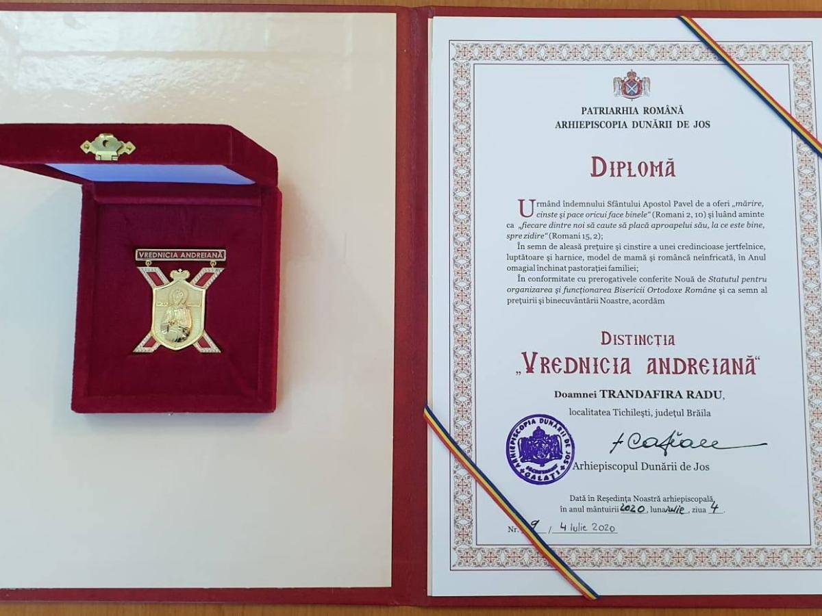 „În semn de aleasă preţuire şi cinstire a acestei credincioase jertfelnice, în «Anul omagial al pastoraţiei părinților şi copiilor», Înaltpreasfinţitul Părinte Casian, Arhiepiscopul Dunării de Jos, i-a oferit doamnei Trandafira Radu distincţia eparhială «Vrednicia andreiană». Ierarhul Dunării de Jos a fost sensibilizat de modul în care «Mamaia Firica», așa cum este cunoscută în satul brăilean Tichileşti, a ştiut şi a reuşit, pe parcursul celor 100 de ani de viaţă, să-şi ducă traiul cumpătat prin muncă, sacrificii şi credinţă în Milostivul Dumnezeu”, ne-a precizat părintele Rareș Bucur, consilier în cadrul Eparhiei.