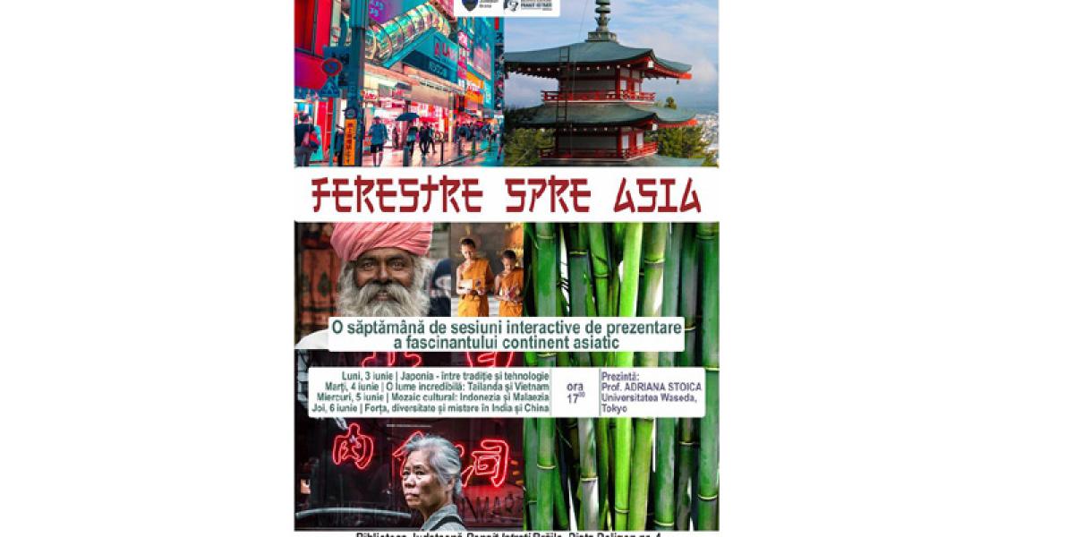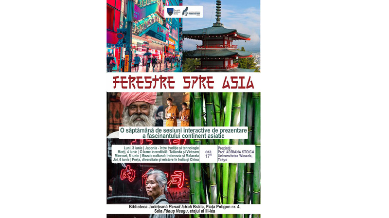 Începând de luni, 3 iunie, ora 17.00, Biblioteca Judeţeană “Panait Istrati” Brăila organizează evenimentul “Ferestre spre Asia”, însemnând o serie de sesiuni interactive de prezentare a fascinantului continent asiatic. Workshop-urile vor fi susţinute de Adriana Stoica, profesor la Universitatea Waseda, Tokyo.