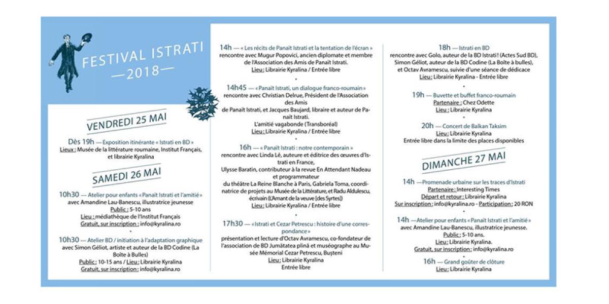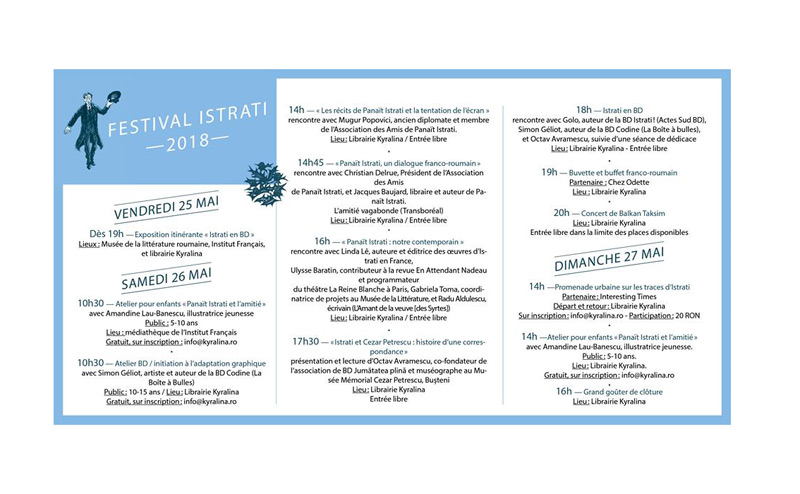 În perioada 26-27 mai 2018, la Librăria franceză Kyralina, din Bucureşti va avea loc un Festival de literatură dedicat lui Panait Istrati.