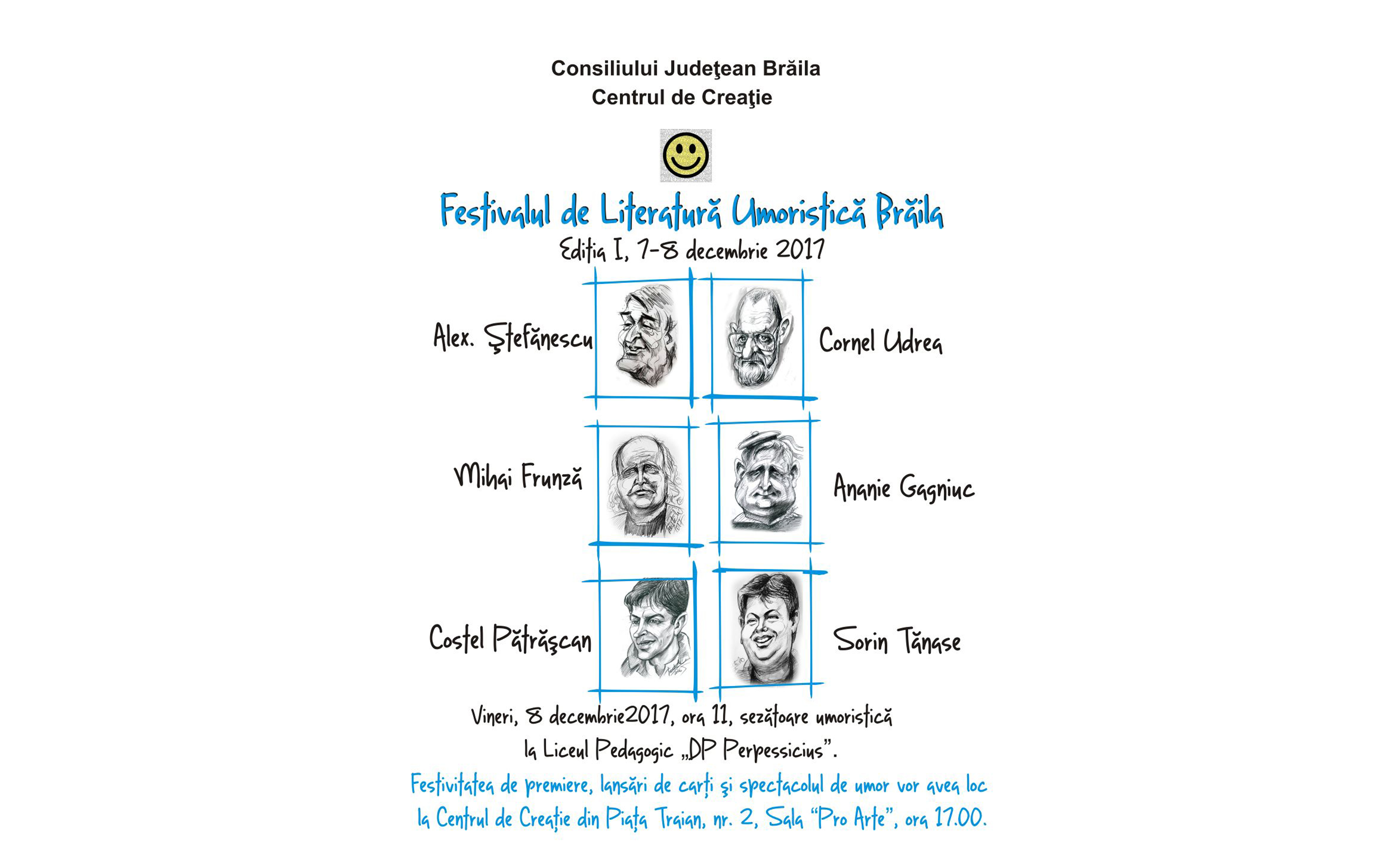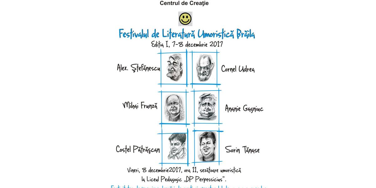 La prima ediţie a Festivalului de Literatură Umoristică desfăşurat la Brăila în perioada 7-8 decembrie 2017 participă reprezentanţi de seamă ai genului. Printre aceştia se numără: Alex Ştefănescu, Cornel Udrea, Mihai Frunză, Ananie Gagniuc, Costel Pătrăşcan şi Sorin Tănase. Manifestarea este organizată de Consiliul Judeţean Brăila, prin Centrul de Creaţie, care şi găzduieşte festivitatea de premiere, cât şi la Liceul Pedagogic.