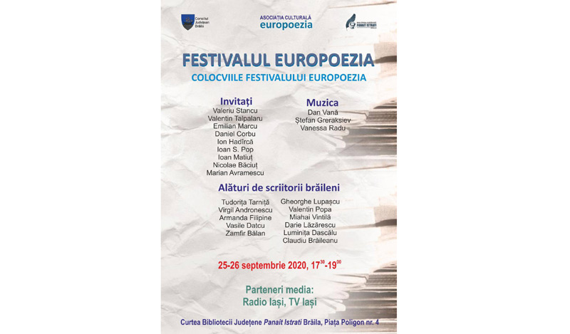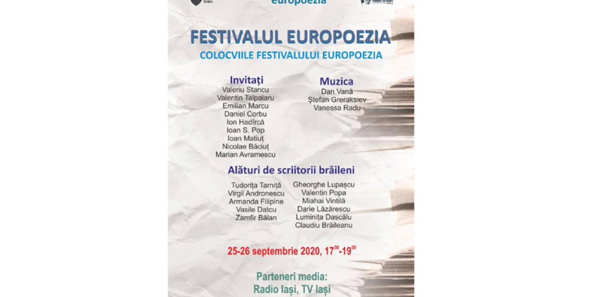 În zilele de 25 şi 26 septembrie 2020, între orele 17.30 şi 19,00, la Brăila se va desfăşura Festivalul Europoezia. Evenimentul este organizat de Biblioteca Judeţeană „Panait Istrati” Brăila împreună cu Asociaţia Culturală „Europoezia” şi se va desfăşura în curtea Bibliotecii din Piaţa Poligon, nr. 4.
