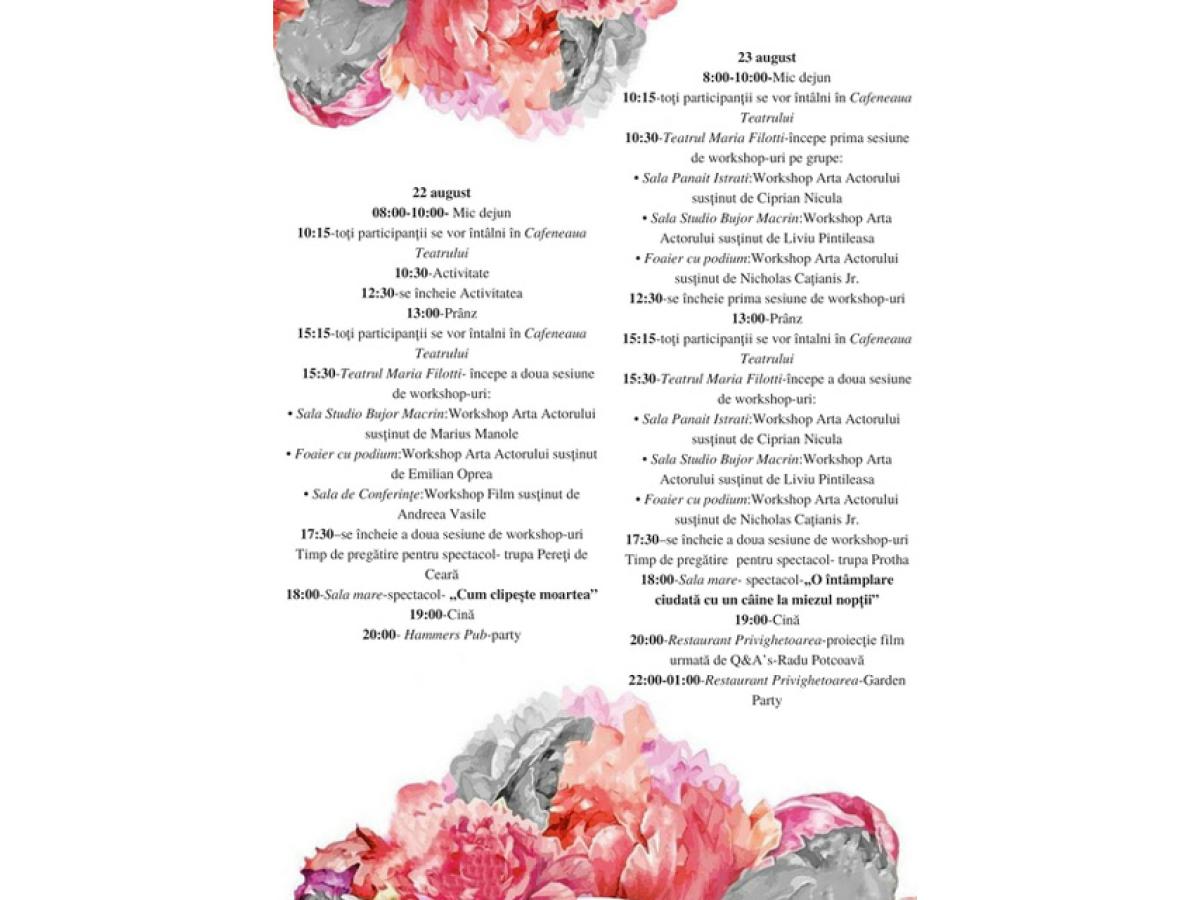 Astăzi, de la ora 18.00, tot în Sala Mare a Teatrului, pe scenă va evolua trupa “Pereţi de Ceară”, cu piesa “Cum clipeşte moartea”. Miercuri, pe 23 august, trupa “Potha” îşi va prezenta spectacolul “ O întâmplare ciudată cu un câine la miezul nopţii”. Joi, 24 august, liceenii din trupa “Gong” vin cu reprezentaţia “Satul electronic”, iar vineri, trupa “Atelierul de teatru” va închide concursul cu spectacolul “Toţi privesc înainte”. Duminică, 27 august, va avea loc Gala de decernare a premiilor, unde se va stabili câştigătorul trofeului “Bujor Macrin”.