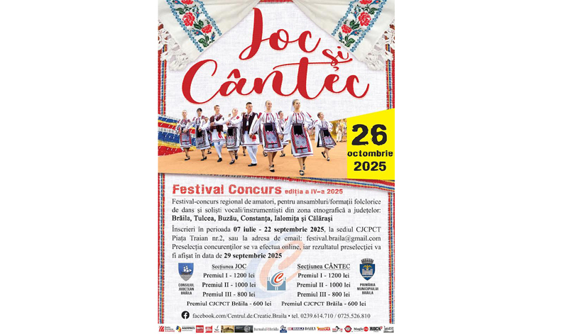 Pregătirile pentru cea de a IV-a ediție a Festivalului Concurs pentru amatori „Joc și cântec” au intrat în linie dreaptă. Organizat de Consiliul Județean, Centrul Județean pentru Conservarea și Promovarea Culturii Tradiționale și Primăria Municipiului Brăila, evenimentul are drept scop stimularea interesului pentru receptarea, păstrarea şi punerea în valoare a creaţiilor populare în rândul tinerilor amatori, a frumuseţii portului popular, apropierea de tradiţiile populare, dar şi descoperirea, cultivarea şi promovarea formaţiilor de dansuri populare, a ansamblurilor folclorice din județul Brăila și a soliștilor ce duc mai departe cântecul popular brăilean.