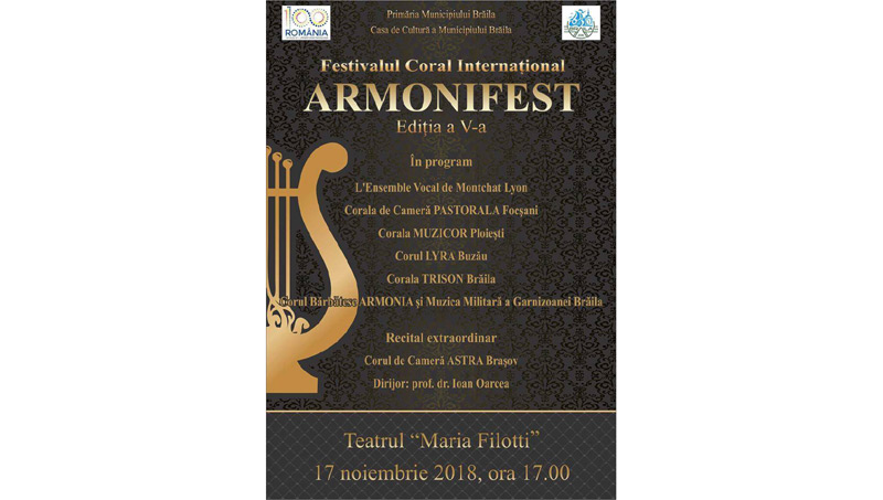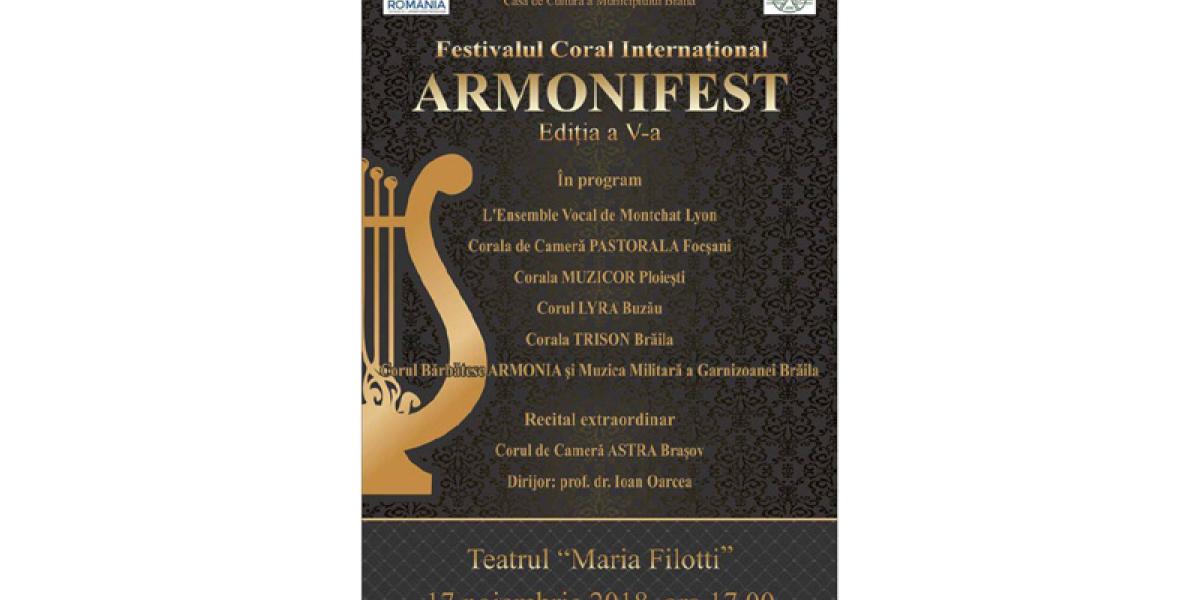 Sâmbătă, 17 noiembrie 2018, începând cu ora 17.00, la Teatrul “Maria Filotti”, se va desfăşura cea de a cincea ediţie a Festivalului Coral ARMONIFEST, manifestare organizată de Casa de Cultură a Municipiului Brăila, cu sprijinul Primăriei Municipiului şi teatrului brăilean.