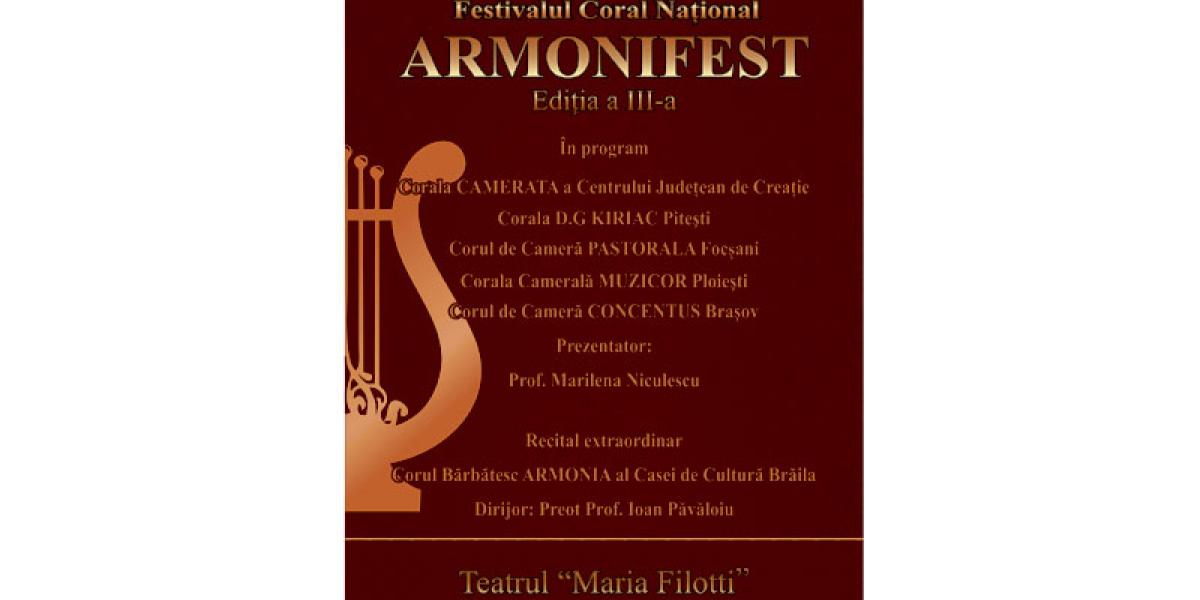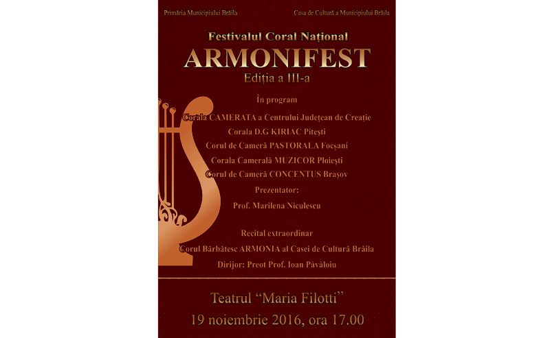 Sâmbătă, 19 noiembrie 2016, începând cu ora 17.00, la Teatrul „Maria Filotti,” se va desfăşura cea de a treia ediţie a Festivalului Coral Naţional ARMONIFEST, manifestare organizată de Casa de Cultură a Municipiului Brăila, cu sprijinul Primăriei Municipiului. Pe scena teatrului brăilean vor urca formaţii corale consacrate din ţară şi din plan local, care vor prezenta piese laice şi religioase din marea literatură corală românească şi universală.