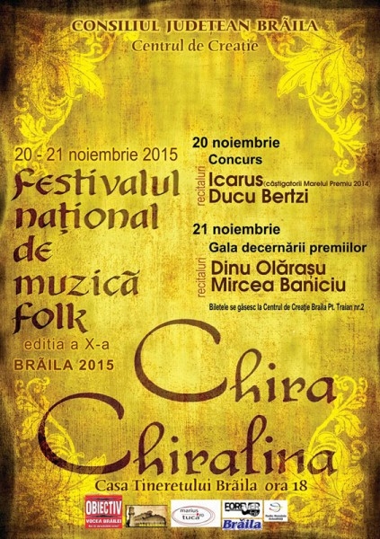 Festivalul Naţional de Folk "Chira Chiralina", care trebuia să se desfăşoare în zilele de 20 şi 21 noiembrie, la Casa Tineretului Brăila, este anulat, ca urmare a unor lucrări de amenajare pe linia securităţii la incendiu a clădirii. Anunţul a fost făcut de Centrul Judeţean pentru Conservarea şi Promovarea Culturii Tradiţionale Brăila. Persoanele care au achiziţionat bilete pentru cele două zile de spectacol pot recupera contravaloarea acestora de la sediul Centrului Judeţean pentru Conservarea şi Promovarea Culturii Tradiţionale Brăila, Piaţa Traian nr 2, în intervalul orar 9-17.