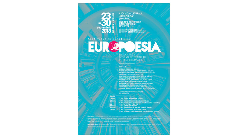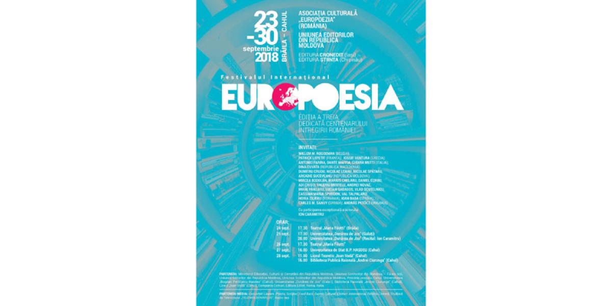 În acest an, cea de a treia ediţie a Festivalului Internaţional EuroPoesia este dedicat centenarului întregirii României şi va avea loc în perioada 23-30 septembrie. Manifestarea este organizată de Asociaţia Culturală Europoezia, Uniunea Editorilor din Republica Moldova, Editura Cronedit Iaşi şi Editura Ştiinţa din Chişinău. Festivalul se va desfăşura în oraşele Brăila, Galaţi şi Cahul şi se va bucura de participarea exepţională a actorului Ion Caramitru. Printre invitaţi se numără: Willem M. Roggeman - Belgia, Patrick Lepetit - Franţa, Iossif Ventura -Grecia, Antonio Farina, Dante Maffia, Chiara Mutti - Italia, Dina Cuvata -Republica Macedonia, Dumitru Crudu, Nicolae Leahu, Nicolae Spătaru, Arcadie Suceveanu - Republica Moldova, Mircea Bodolan, Marius Chelaru, Daniel Corbu, Adi Cristi, Valeriu Mititelu, Andrei Novac, Mihai Pânzaru, Lucian Sabados, Vlad Scutelnicu, Cassian Maria Spiridon, Valentin Talpalaru, Horia Zilieru - România, Ioan Baba - Serbia, Charles M.Sanuy - Spania şi Andras Petocz - Ungaria.