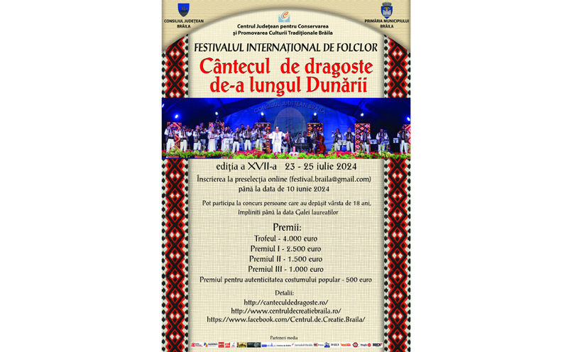 „Atât portul tradițional, cât și muzica populară, fac parte din identitatea românilor, iar pentru a scoate mai mult în evidență importanța folclorului autentic, timp de trei zile - 23, 24 și 25 iulie 2024 - la Brăila, va avea loc cea de-a XVII-a ediție a Festivalului Internațional de Folclor „Cântecul de dragoste de-a lungul Dunării”, organizat de Consiliul Județean Brăila, prin Centrul Județean pentru Conservarea și Promovarea Culturii Tradiționale și Primăria Municipiului Brăila, pe scena de la Esplanada Dunării, o incursiune în folclorul autentic național și internațional, un regal folcloric cu ansambluri, concurenți și artiști de renume, din țară și străinătate”, precizează organizatorii evenimentului.
