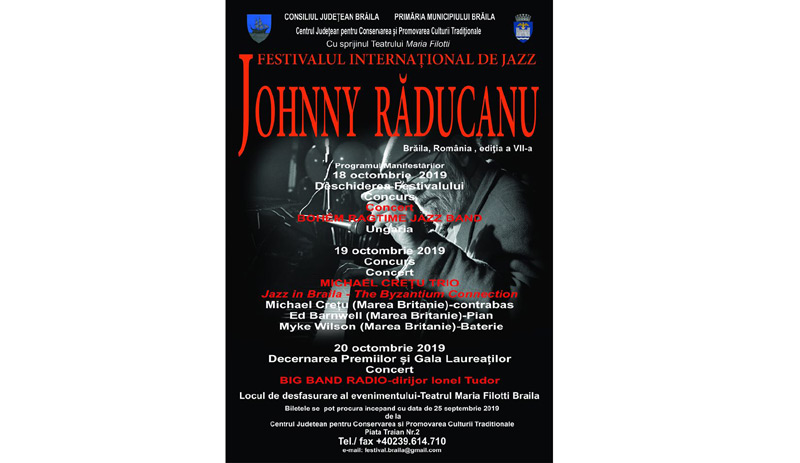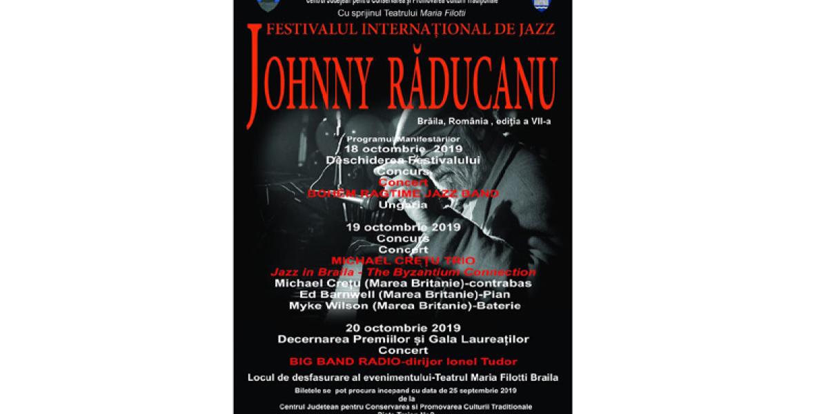 În perioada 18-20 octombrie 2019, Teatrul “Maria Filotti” Brăila va găzdui cea de a VII-a a ediţie a Festivalului Internaţional de Jazz “Johnny Răducanu”, manifestare organizată de Consiliul Judeţean Brăila, prin Centrul Judeţean pentru Conservarea şi Promovarea Culturii Tradiţionale Brăila. Organizat ca un omagiu adus brăileanului JOHNNY RĂDUCANU, recunoscut în toată lumea, festivalul îşi propune descoperirea şi promovarea noilor talente interpretative, dar, pe toată durata concursului vor avea loc şi recitaluri susţinute de artişti consacraţi ai genului.