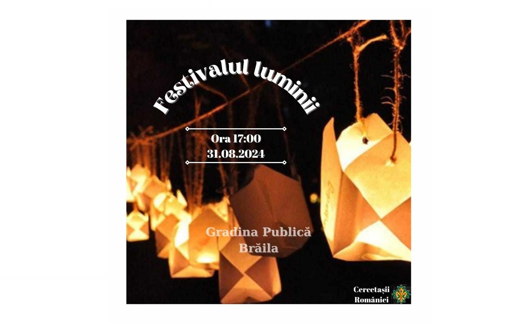 Sâmbătă, 31 august, în Grădina Publică a Brăilei, are loc Festivalul Luminii, eveniment organizat, începând cu ora 17.00 și până la ora 21.00, de Cercetașii României - Centrul Local „Nufărul Alb” Brăila, alături de 140 de cercetași din localitățile Galați, Tecuci, Matca, Constanța și Iași. În cadrul festivalului, vor fi organizate mai multe ateliere de creativitate și abilitate și va fi prezentat un program artistic cu muzică live, susținut de talentații elevi ai Școlii Populare de Arte „Vespasian Lungu” Brăila.
