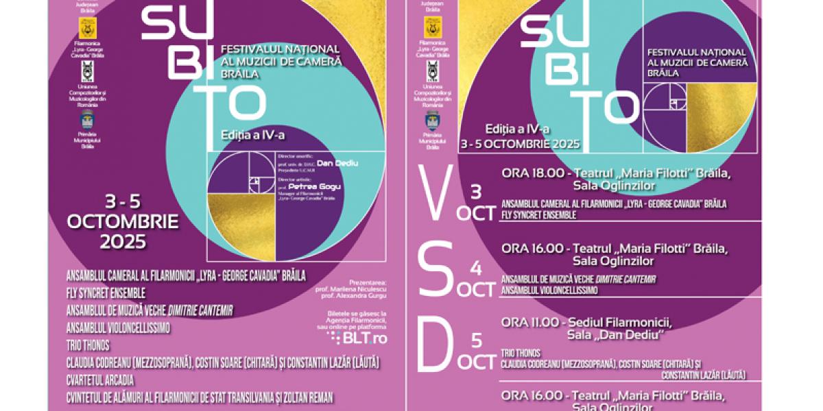 „SUBITO - neașteptatul, revelația, clipa de grație în care muzica devine miracol și lasă în noi o altă lumină. Acesta este spiritul pe care îl aduce la Brăila, între 3 și 5 octombrie 2025, cea de-a patra ediție a Festivalului Național al Muzicii de Cameră SUBITO, un eveniment organizat de Filarmonica „Lyra - George Cavadia”, cu sprijinul Consiliului Județean Brăila, al Primăriei Municipiului Brăila și al Uniunii Compozitorilor și Muzicologilor din România”, precizează prof. Alexandra Gurgu, secretar muzical al Filarmonicii „Lyra - George Cavadia” Brăila.