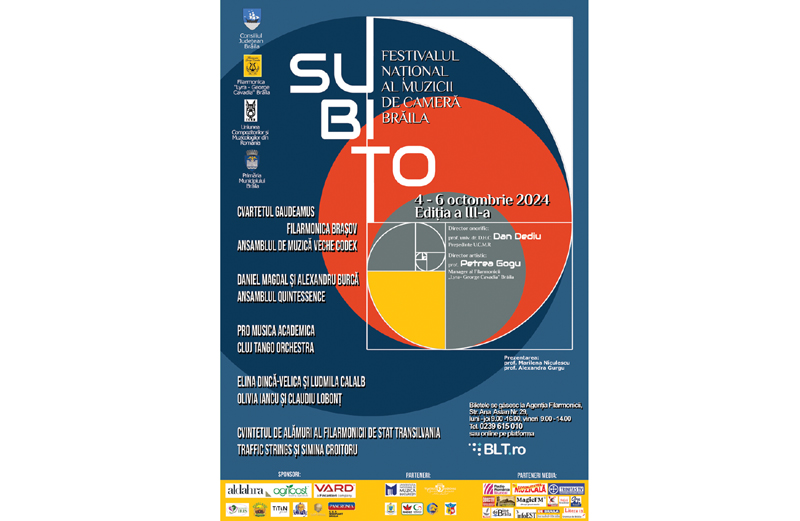 • în perioada 4-6 octombrie, are loc cea de a III-a ediție a Festivalului Național al Muzicii de Cameră SUBITO • evenimentul reunește cei mai buni interpreți și cele mai titrate ansambluri din România și este organizat de Filarmonica „Lyra - George Cavadia”, Consiliul Județean Brăila, Uniunea Compozitorilor și Muzicologilor din România și Primăria Municipiului Brăila • prima orchestră de tango argentinian din Transilvania, va concerta la Brăila