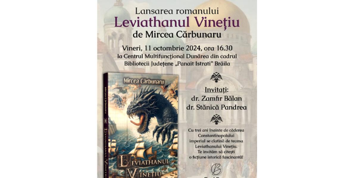Vineri, 11 octombrie 2024, la ora 16:30, Centrul Multifuncțional ”Dunărea” din cadrul Bibliotecii Județene ”Panait Istrati” va găzdui lansarea cărții „Leviathanul Vineţiu” de Mircea Cărbunaru.