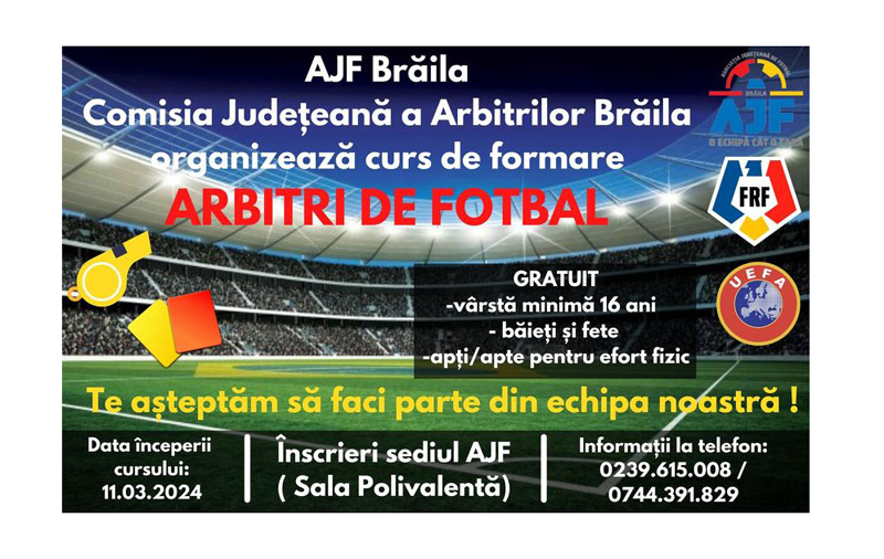 Comisia Județeană de Arbitri Brăila din cadrul A.J.F. Brăila se alătură proiectului Federației Române de Fotbal, Comisiei Centrale a Arbitrilor, de dezvoltare a arbitrajului și pe 11 martie demarează un nou curs de formare a arbitrilor de fotbal.