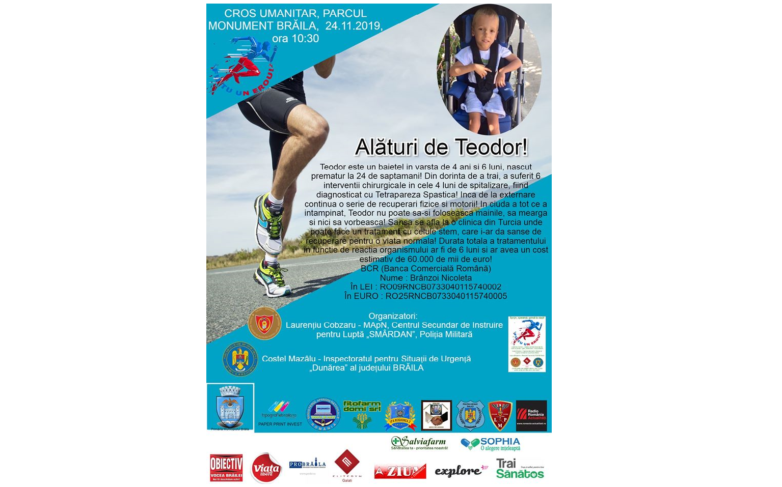 Cei care nu pot ajunge la crosul caritabil de duminică pot face donaţii în conturile deschise pe numele Brânzoi Nicoleta, mama lui Teodor, la BCR.