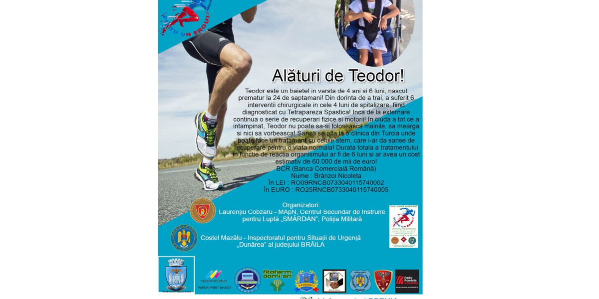 “Viaţa l-a aruncat într-o luptă teribilă, din care nu are voie să iasă decât victorios. Iar pentru asta are nevoie de ajutorul nostru. Aşadar, indiferent de vârstă, condiţie fizică ori performanţe sportive, vă invităm la un cros umanitar, maxim 10 ture (10 km), în jurul Orăşelului Copiilor. Este distanţa care îi poate aduce eroului nostru Teodor şansa la o nouă viaţă, prin plata tratamentului mult prea costisitor pentru familia lui. La faţa locului va exista un punct de revitalizare cu apă, batoane energizante, alături de urna special amenajată în care fiecare va putea să ajute cu cât doreşte, în funcţie de posibilităţi”, este mesajul transmis de organizatori.