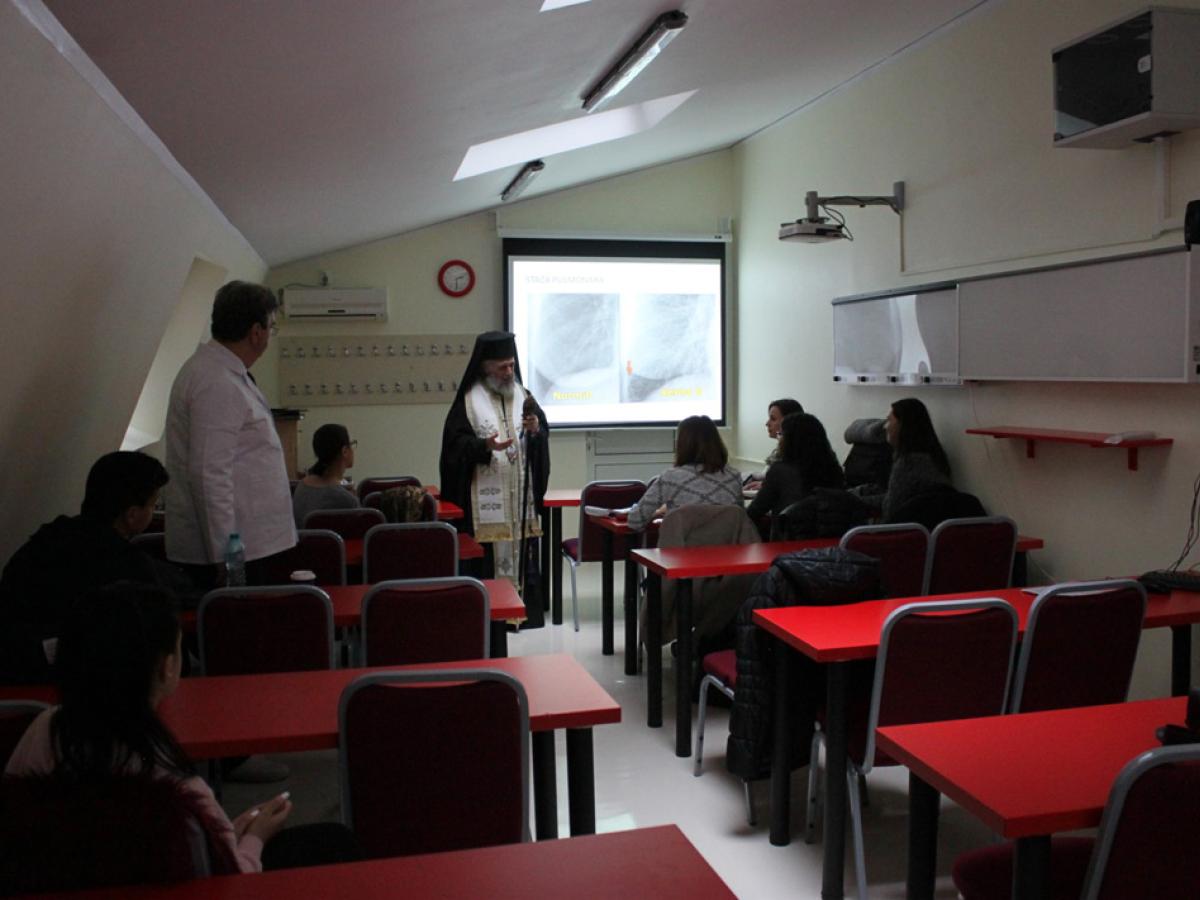 Părintele Arhiepiscop i-a vizitat şi pe studenţii Facultăţii de Medicină şi Farmacie din Galaţi, aflaţi la cursuri practice în cadrul spitalului, cu care a avut un dialog de suflet, şi a adresat cuvinte de apreciere pentru efortul pe care aceştia îl depun în pregătirea lor temeinică spre a deveni oameni de nădejde în sprijinirea semenilor aflaţi în suferinţă.