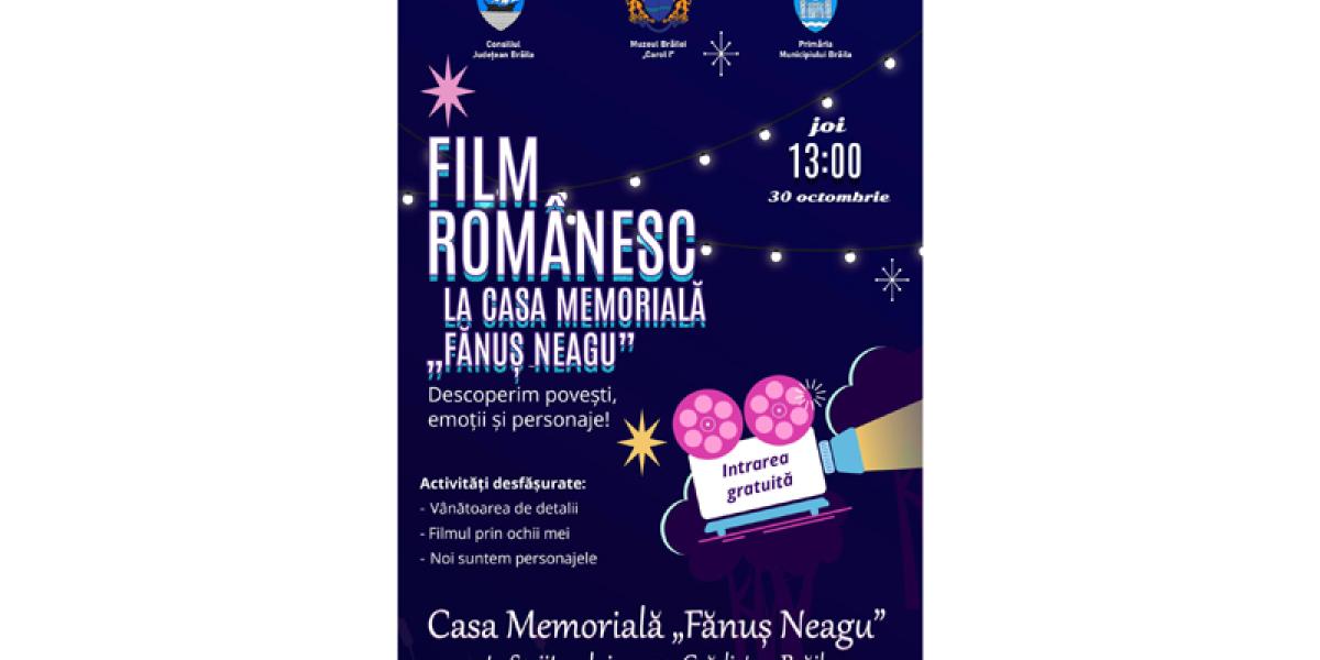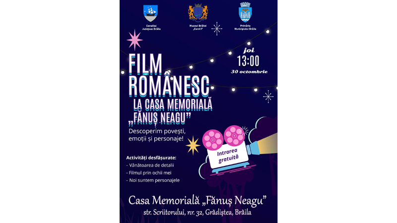 Muzeul Brăilei „Carol I” - Casa Memorială ,,Fănuș Neagu”, organizează joi, 30 octombrie 2025, începând cu ora 13:00, activitatea „Film românesc la Casa Memorială „Fănuș Neagu” - Descoperim povești, emoții și personaje”. Activitatea coordonată de de Roxana Serea, muzeograf la Casa Memorială „Fănuș Neagu”, din comuna Grădiștea, JUDEȚUL Brăila, va include: „Vânătoarea de detalii”; „Filmul prin ochii mei”; „Noi suntem personajele”. Participă copii din satul natal al marelui scriitor.